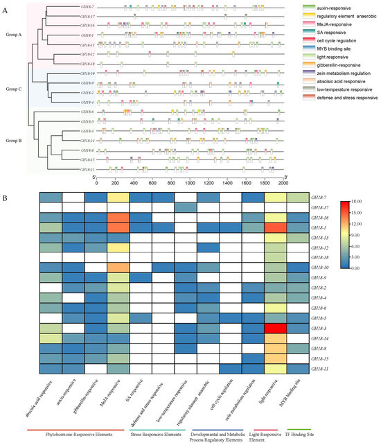 Cis-acting element analysis of the GH18 gene promoters revealed 12 common types of elements that are widely distributed among family members (Figure 7A). These include auxin-responsive, regulatory element anaerobic, MeJA-responsive, SA-responsive, cell cycle regulation, MYB binding site, light-responsive, gibberellin-responsive, zein metabolism regulation, abscisic acid-responsive, low-temperature-responsive, and defense- and stress-responsive types. Phytohormone-responsive elements (including auxin-responsive, MeJA-responsive, SA-responsive, gibberellin-responsive, and abscisic acid-responsive elements) were the most prevalent and phylogenetically conserved regulatory features, identified in the promoter regions of 16 GH18 gene members, with the exception of GH18-17 and GH18-18. Stress-responsive elements (encompassing regulatory, anaerobic, low-temperature-responsive, defense-responsive, and stress-responsive elements) were presented in 12 members. Light-responsive elements occurred in 17 members, with GH18-3 containing the highest number (11), while GH18-17 lacked them entirely. Among developmental and metabolic process regulatory elements, cell cycle regulation elements were exclusive to GH18-1, GH18-5, and GH18-11, whereas zein metabolism regulation elements were detected in GH18-1, GH18-2, GH18-3, GH18-4, GH18-5, GH18-7, GH18-11, GH18-14, GH18-15, and GH18-16. MYB transcription factor binding sites were found in 12 members, with GH18-6, GH18-12, GH18-14, GH18-15, GH18-17, and GH18-18 showing their absence (Figure 7B).