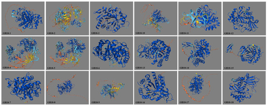 The GH18 proteins are predicted to consist primarily of α-helix (14.50–36.64%), extended strand (10.40–17.93%), and random coil (47.07–71.59%), with no β-turns present (Table 3). The α-helix and random coil are the most abundant structural elements among all family members, achieving an evolutionary balance between conformational flexibility and catalytic rigidity. AlphaFold models indicate that GH18 proteins adopt the TIM8-barrel (also known as TIM barrel) folding pattern, which is characteristic of GH18 chitinases and is a common β-folded barrel structure composed of eight parallel β-folded chains. Within each subclade, the 3D structures are highly conserved; however, clear structural differences are evident between subclades (Figure 8).