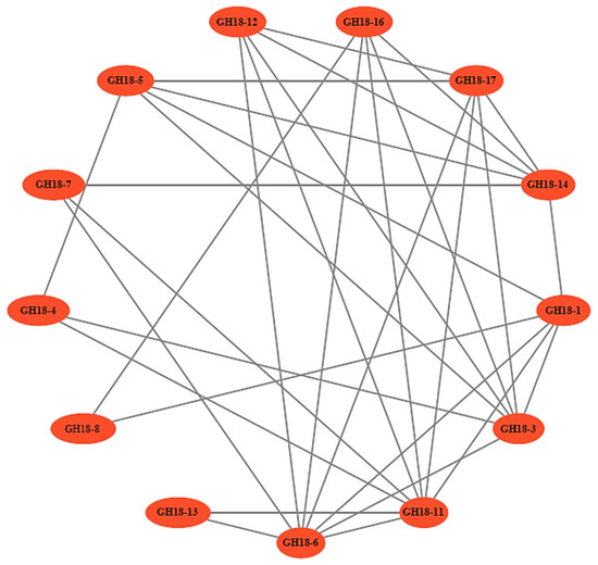 The protein–protein interaction network serves as a vital resource for predicting functional orthologs within homologous gene clusters, thereby offering a significant foundation for elucidating gene interactions and regulatory networks. A considerable number of interactions among the 13 GH18 family proteins indicated that they may collectively establish an interaction network that enhances the efficiency of chitin degradation (Figure 9).