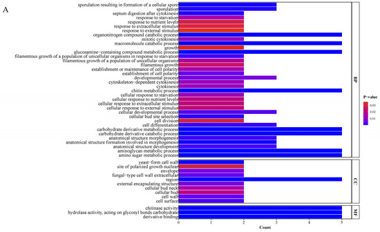 GO and KEGG enrichment analysis of T6 GH18 family genes. (A) Bar chart of GO enrichment analysis for 18 GH18 genes. (B) Scatter plot of KEGG enrichment analysis for 18 GH18 genes.