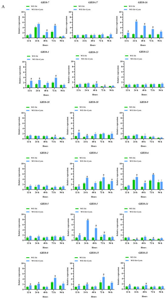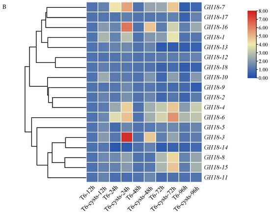 The relative expression levels of the GH18 family genes at different time points after T6 mycelia parasitized on the surface of the H. avenae cysts. Actin served as the internal reference gene, with the expression level of each gene member at 12 h used as the control. (A) Detailed expression patterns, the relative expression data were analyzed using paired sample t-tests to identify significant differences, with * indicating a significant difference at the p < 0.05 level. The error bars represent standard error calculated from three replicates. (B) The expression levels are illustrated in the form of a heat map.