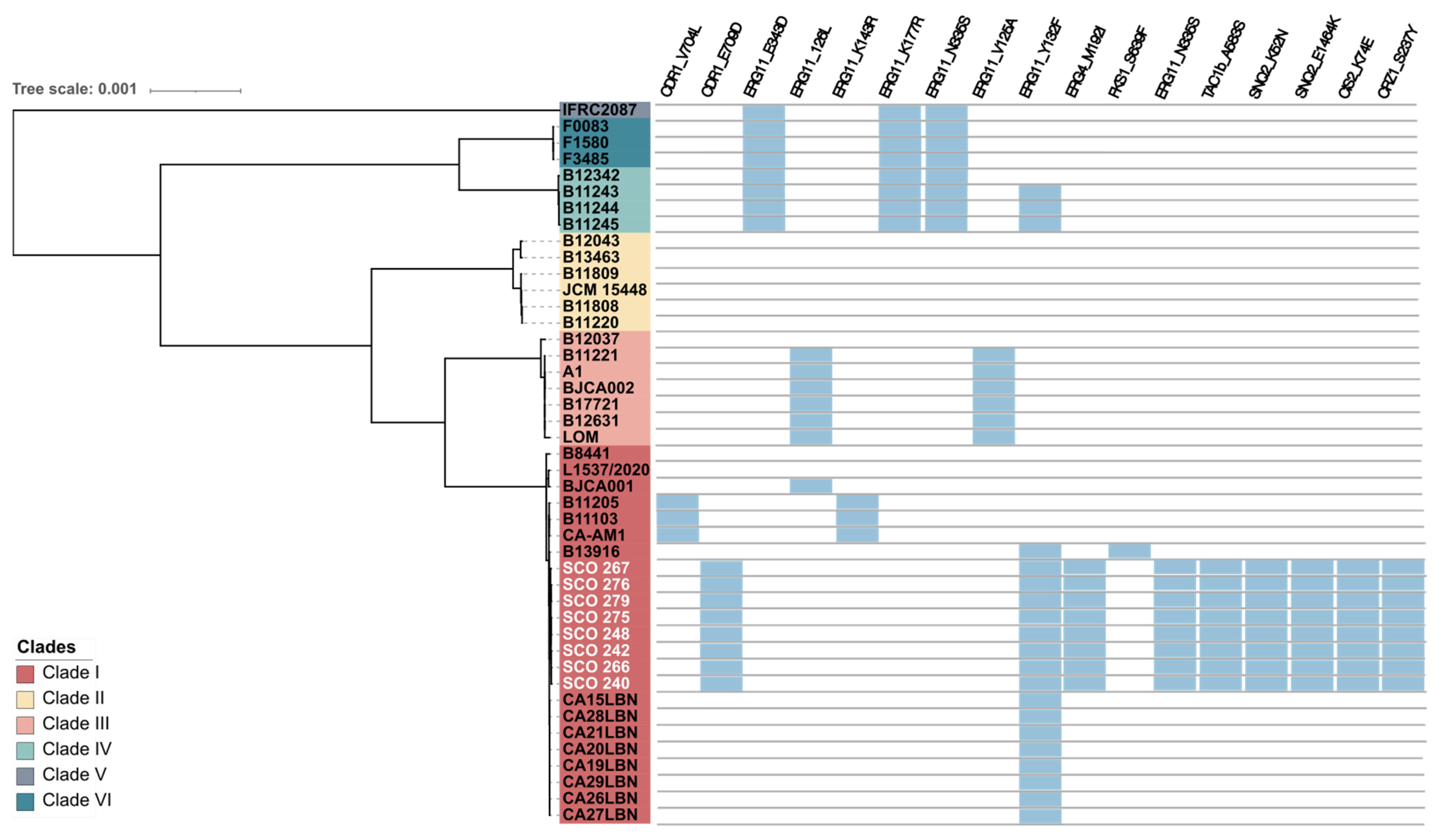 - Suphavilai, C.; Ko, K.K.K.; Lim, K.M.; Tan, M.G.; Boonsimma, P.; Chu, J.J.K.; Goh, S.S.; Rajandran, P.; Lee, L.C.; Tan, K.Y.; et al. Detection and characterisation of a sixth Candida auris clade in Singapore: A genomic and phenotypic study. Lancet Microbe 2024, 5, 100878. [Google Scholar] [CrossRef]