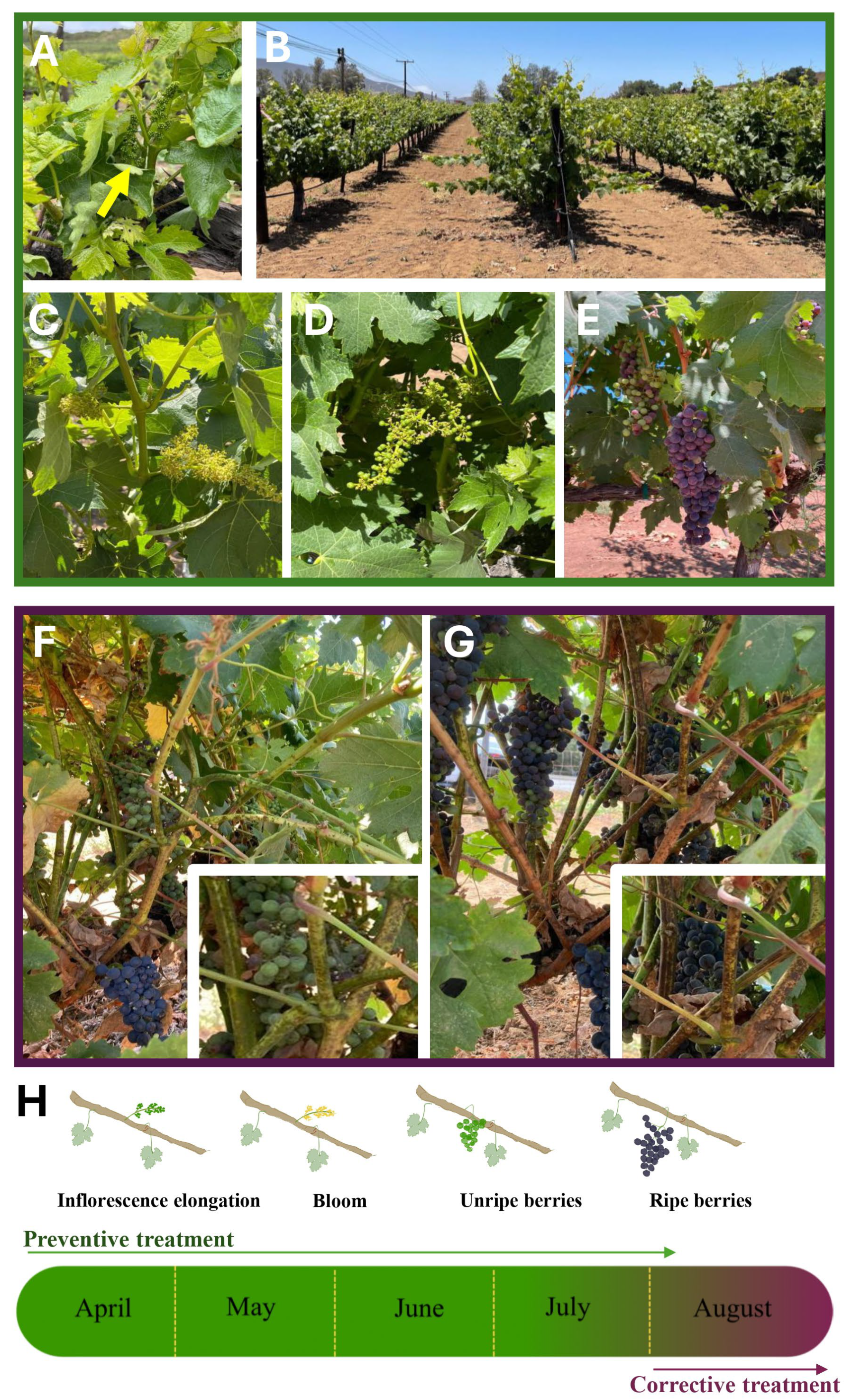 - García-Reséndiz, K.G.; Moyano-Briones, G.; López-Simancas, P.; Úrbez-Torres, J.R.; Hernández-Martínez, R.; Carrillo-Tripp, J. Epidemiological survey of grapevine leafroll and red blotch diseases in Baja California, Mexico. Am. J. Enol. Vitic. 2025, 76, 0760007. [Google Scholar] [CrossRef]