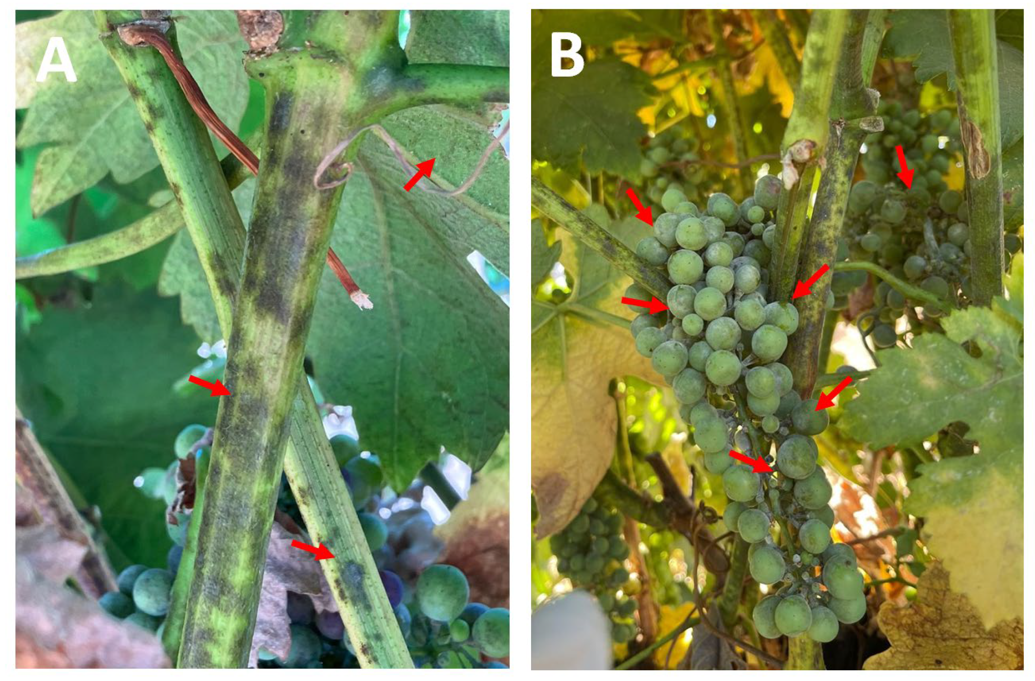 - Rangel-Montoya, E.A.; Candolfi-Arballo, O.; Obrador-Sánchez, J.A.; Valenzuela-Solano, C.; Hernandez-Martinez, R. Enhancing epidemiological knowledge of Botryosphaeriaceae in Mexican vineyards. Phytopathol. Mediterr. 2024, 63, 191–206. [Google Scholar] [CrossRef]
