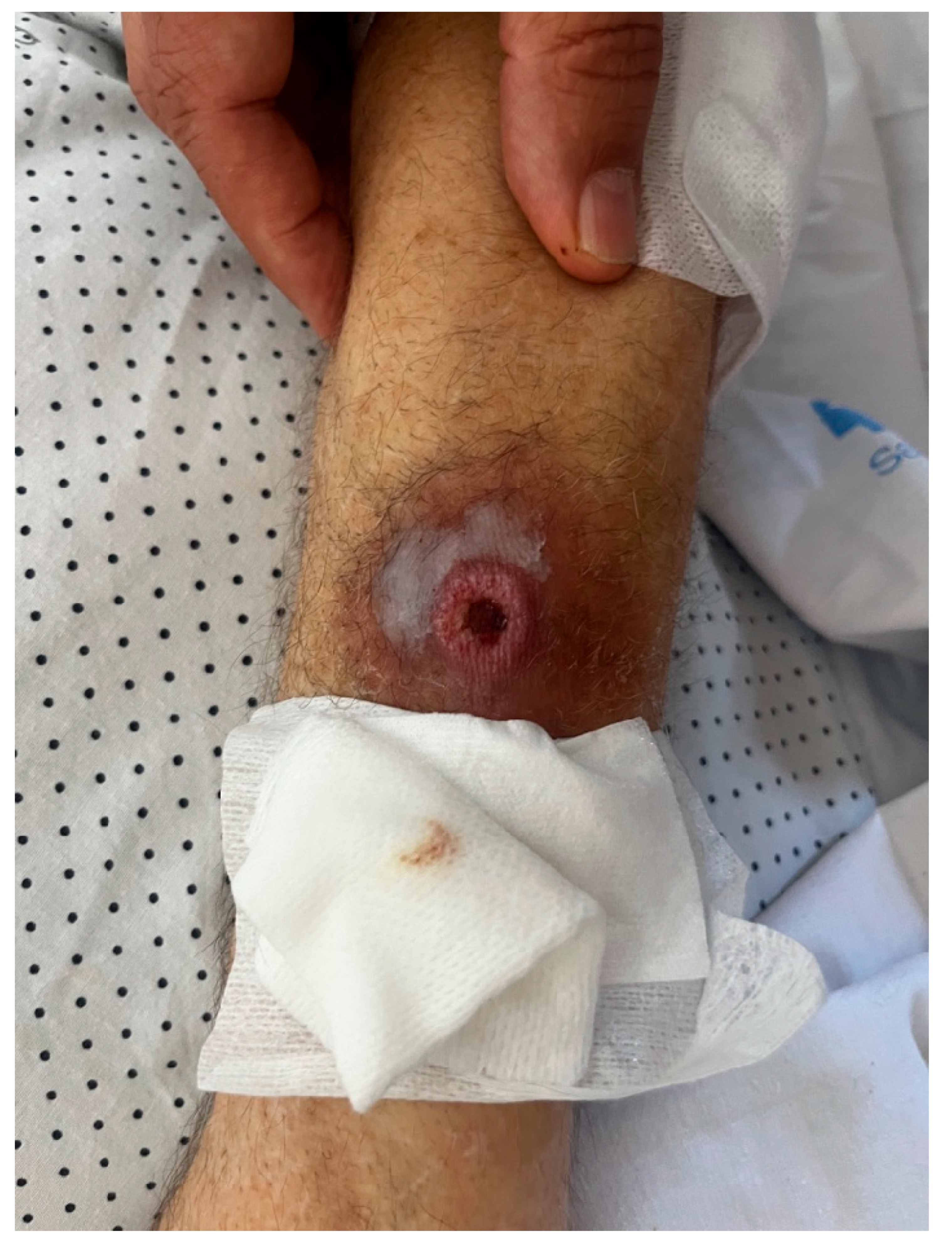 Despite clinical and microbiological improvement, the patient continued to experience daily fever. On re-examination, the lesion on the right forearm worsened and developed into an ulcer (