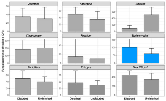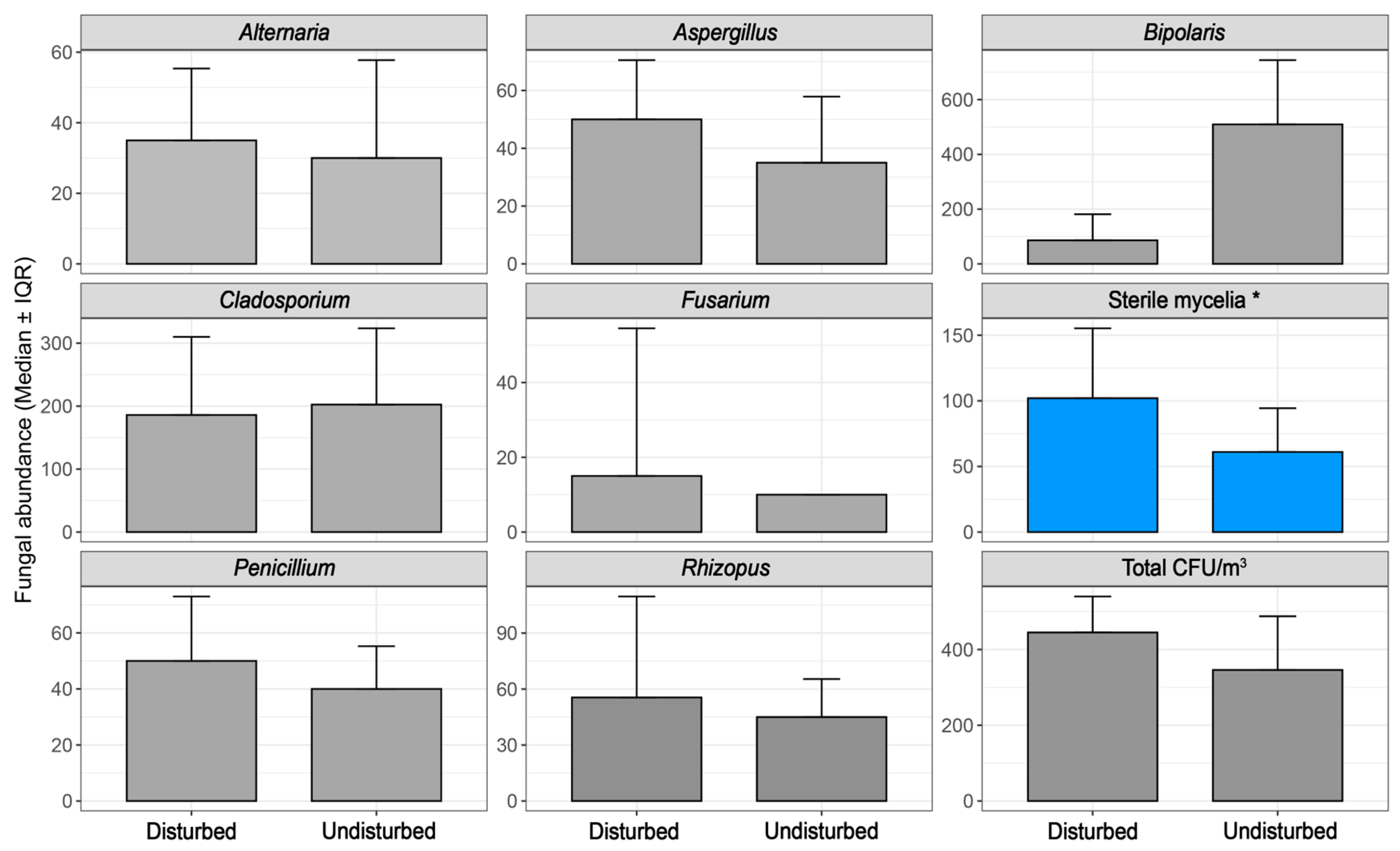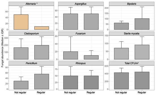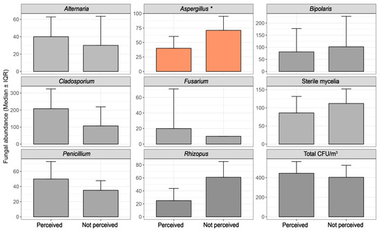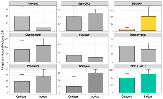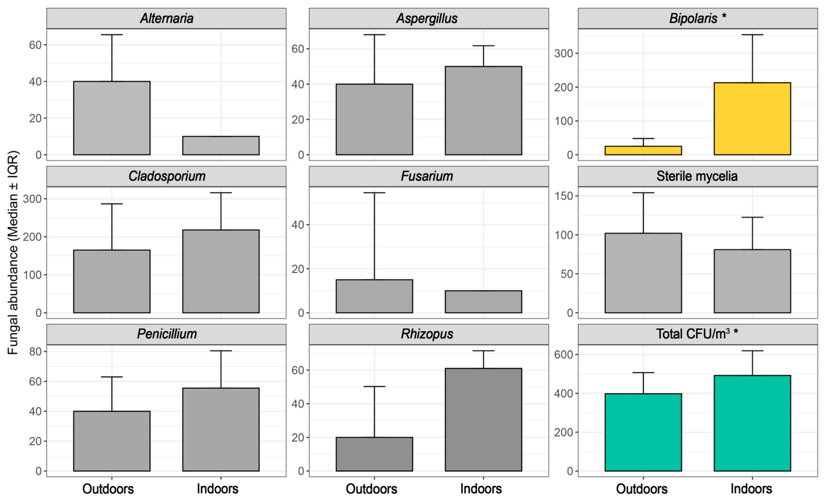 - Crawford, J.A.; Rosenbaum, P.F.; Anagnost, S.E.; Hunt, A.; Abraham, J.L. Indicators of airborne fungal concentrations in urban homes: Understanding the conditions that affect indoor fungal exposures. Sci. Total Environ. 2015, 517, 113–124. [Google Scholar] [CrossRef] [PubMed]