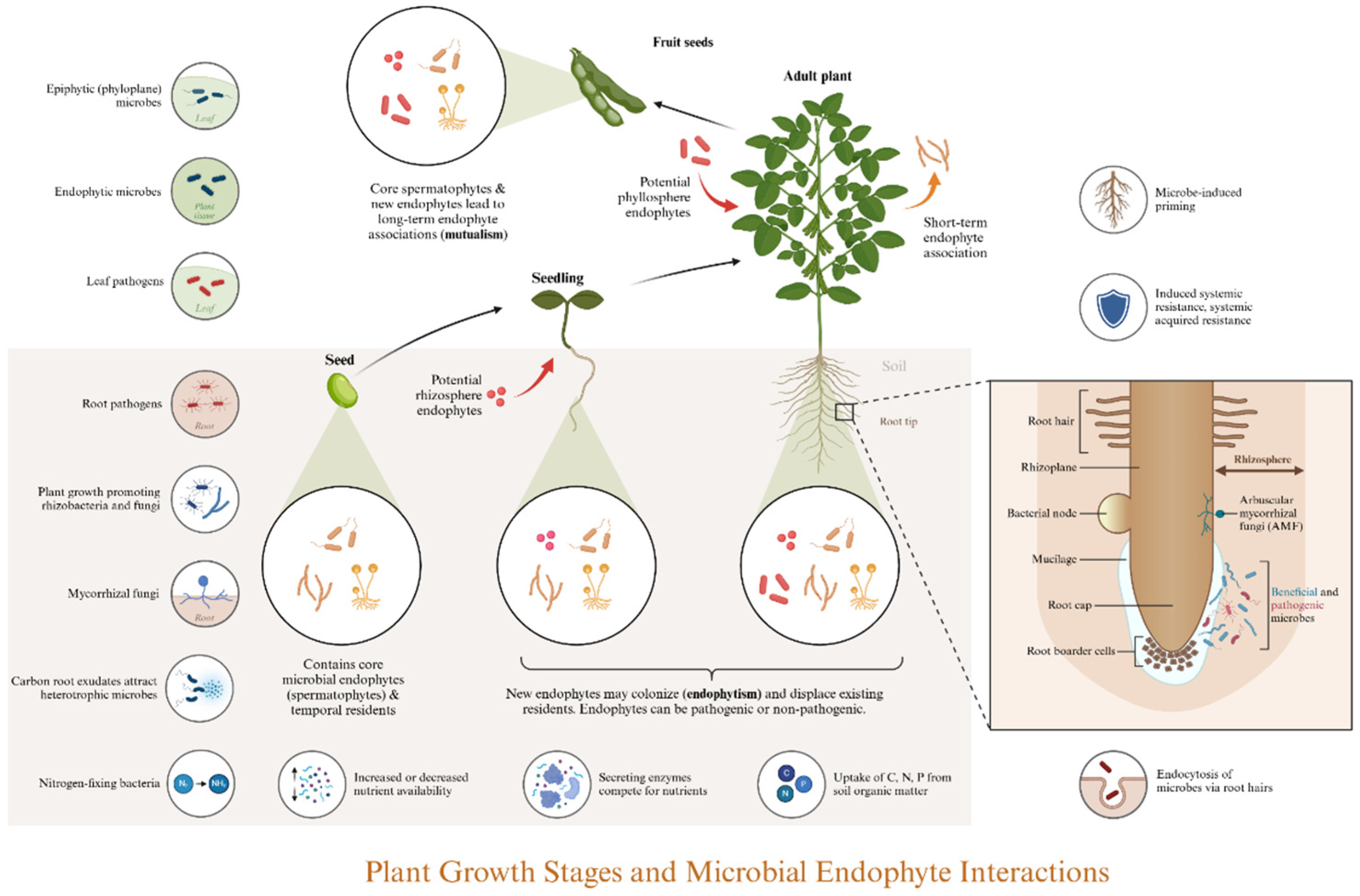 Planting further enriches the diversity of microorganisms. Various host-related factors, including developmental stage and circadian rhythms, influence the structure of the root microbial community [19]. This structure is also partially determined by uncontrollable abiotic factors in the natural environment, which elucidates the challenges associated with culturing many environmental microorganisms, particularly endophytes [20]. Physically, the soil’s water release characteristics and aeration conditions in the rhizosphere are superior to those in non-rhizosphere areas due to the interpenetration of plant roots. Additionally, the diversity of root-associated microorganisms tends to decrease from the surrounding soil to the rhizosphere, root surface, and root interior, indicating a high degree of specialization [21]. Chemically, approximately 20% to 60% of photosynthates produced during plant growth are released into the rhizosphere as root exudates [22]. These exudates can be categorized into two primary categories: small molecular compounds (including amino acids, organic acids, sugars, alcohols, polyamines, fatty acids, purines, plant hormones, terpenes, flavonoids, benzoxazines, etc.) and macromolecular compounds (including polysaccharides and proteins). Root exudates serve multiple functions: (A) surfactants, such as lecithin, help create a hydrophobic environment; (B) organic matter, along with apoptotic roots and their exfoliations—including root hairs, epidermal cells, and root crowns—contributes to a nutrient-rich root environment, serving as vital sources of nutrients and energy; (C) small root exudates function as signaling molecules, with attractants and repellents facilitating the recruitment of rhizosphere microorganisms [23,24]. Particularly, quorum-sensing molecules (QSMs), including volatile compounds, regulate interactions among plants and microorganisms, as well as among microorganisms themselves [25].