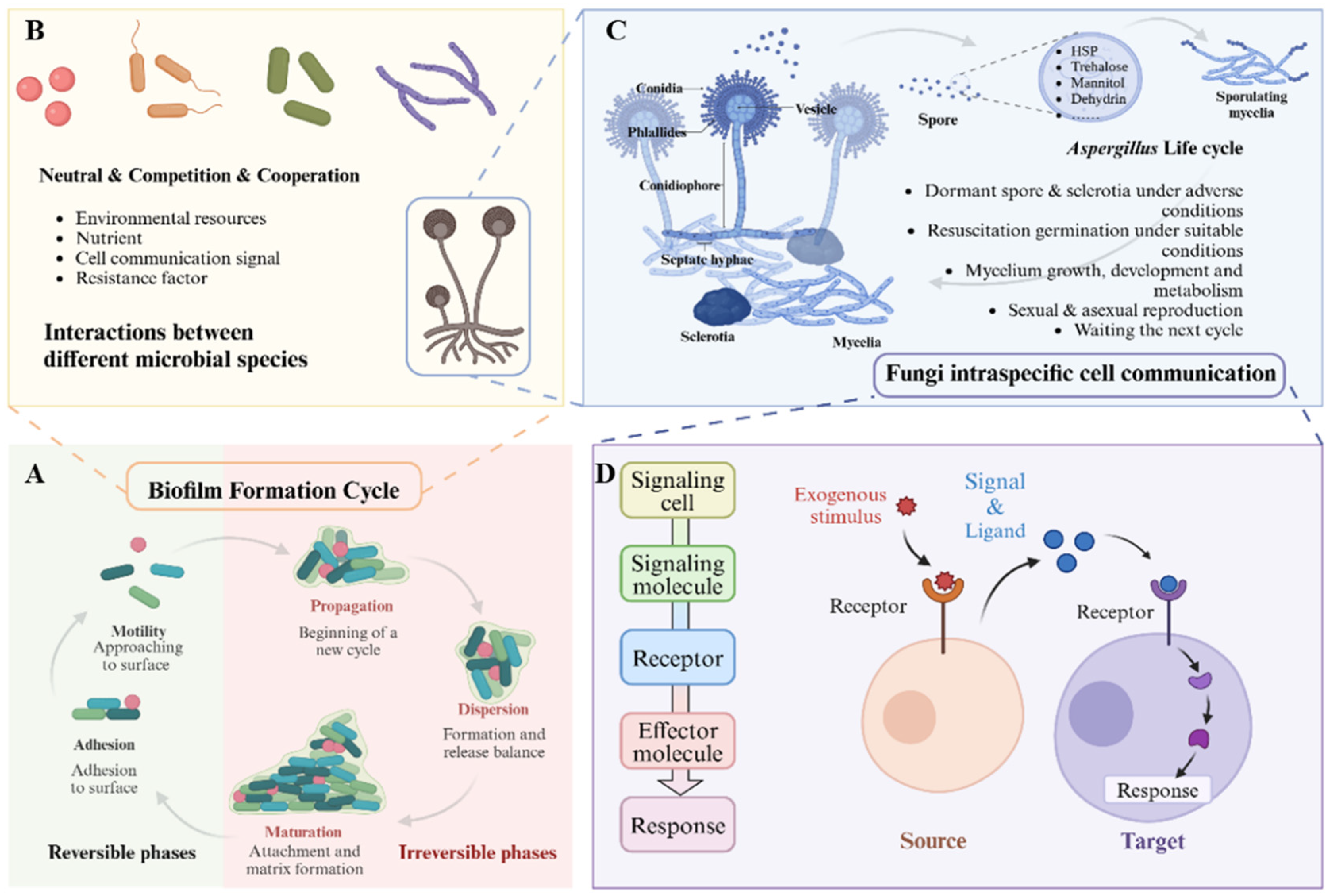 The hyphosphere is a specialized zone within the soil, characterized by the proliferation of fungal mycelia, which distinguishes it from typical soil environments. This zone closely overlaps with plant roots, forming the rhizosphere mycelium. During dynamic interactions with plants, specific microbial communities are recruited and ultimately develop into the rhizosphere microbiome. The mycelial network established by mycelia maintains the stability of this microenvironment and constitutes a diffusion network for signaling molecules, thereby expanding the sensing range of microbial interactions. This phenomenon is commonly referred to as the “fungal superhighway”, with typical filamentous fungi such as Aspergillus and Mucor play an important role [62,63].