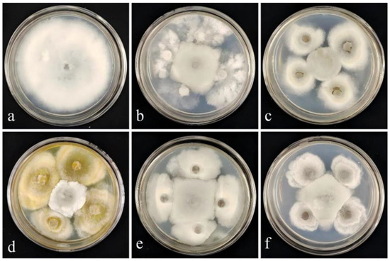 Inhibitory effect of strain DJW5-2-1 against the pathogenic fungus causing RBS. (a) Control group, inoculated solely with pathogenic fungus XY-4; (b) Inhibitory effect of strain DJY1-1; (c) Inhibitory effect of strain DJW5-2; (d) Inhibitory effect of strain DJW5-2-1; (e) Inhibitory effect of strain DJW5-3; (f) Inhibitory effect of strain DJW5-4.