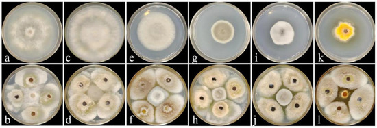 Inhibitory effect of strain DJW5-2-1 against 6 pathogenic fungi. (a,b) Pathogen C4 causing Hedera helix leaf blight in the control group and its corresponding treatment group, respectively. (c,d) Pathogen GB1 causing gray mold of Vaccinium corymbosum in the control group and its corresponding treatment group, respectively. (e,f) Pathogen Q13 causing anthracnose of Begonia semperflorens in the control group and its corresponding treatment group, respectively. (g,h) Pathogen FX-4 causing leaf spot of Impatiens hawkeri in the control group and its corresponding treatment group, respectively. (i,j) Pathogen X64 causing leaf spot of Hydrangea macrophylla in the control group and its corresponding treatment group, respectively. (k,l) Pathogen Y1 causing leaf spot of Rhus chinensis in the control group and its corresponding treatment group, respectively.