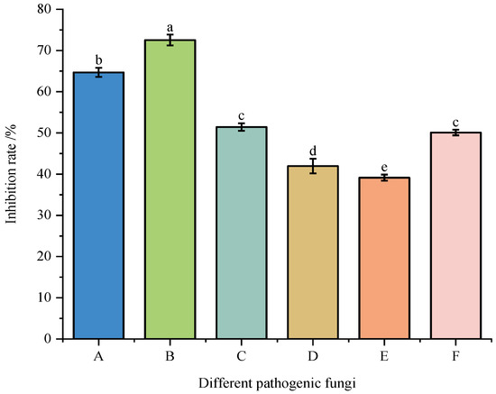 Inhibition rates of strain DJW5-2-1 against six pathogenic fungi. (A–F) represent C4, GB1, Q13, FX-4, X64, and Y1, respectively. Note: Different lowercase letters indicate significant differences at p < 0.05.