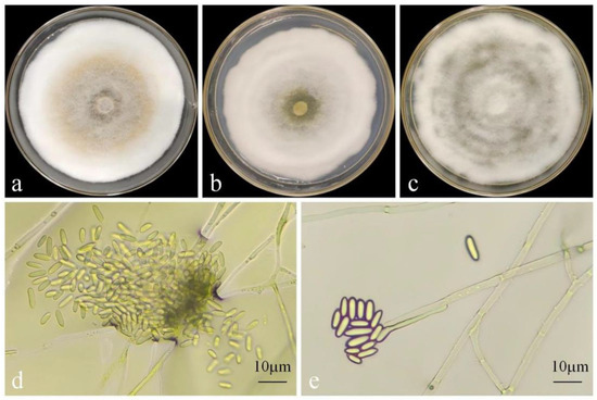 Morphological characteristics of strain DJW5-2-1. (a) Colony grown on PDA medium for 7 days; (b) colony grown on PSA medium for 7 days; (c) colony grown on CA medium for 7 days; (d) conidia; and (e) mycelia and conidiophores.