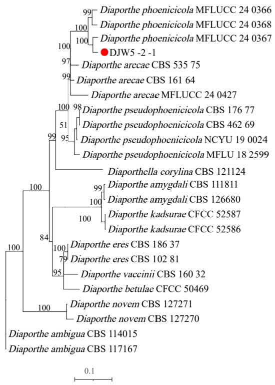 PCR amplification of strain DJW5-2-1 using ITS, TEF, and TUB2 primers generated gene fragments of 702 bp, 383 bp, and 808 bp, respectively. The resulting sequences were submitted to the GenBank database. Following BLAST alignment, homologous reference sequences were selected and downloaded (Table 2). These sequences were concatenated in the order ITS–TEF–TUB2 to construct a multilocus phylogenetic tree. As shown in Figure 5, strain DJW5-2-1 clustered within the same clade as Diaporthe phoenicicola MFLUCC:24-0367, with a bootstrap support value of 100%. The morphological characteristics were consistent with the molecular identification results, confirming that strain DJW5-2-1 belongs to D. phoenicicola.