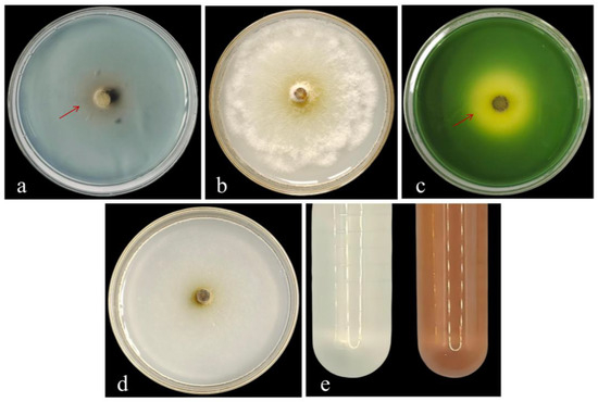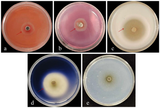 Determination of cell wall-degrading enzyme activities of strain DJW5-2-1. (a) β-glucanase; (b) cellulase; (c) protease; (d) amylase; (e) chitinase. The red arrow indicates the location of the hydrolysis zone.