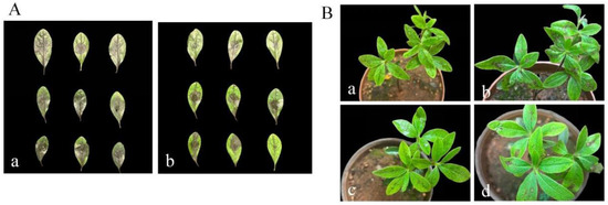 Biocontrol efficacy of strain DJW5-2-1 on in vitro leaves and in vivo potted plants. (A) Biocontrol on in vitro leaves: (a) control group; (b) treatment group; (B) biocontrol efficacy of in vivo potted plants: (a) control group at 0 d; (b) control group at 7 d; (c) treatment group at 0 d; (d) treatment group at 7 d.