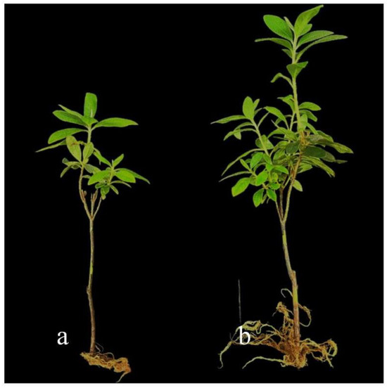 Growth-promoting effect of strain DJW5-2-1 on rhododendron seedlings. (a) Control group; (b) treatment group.