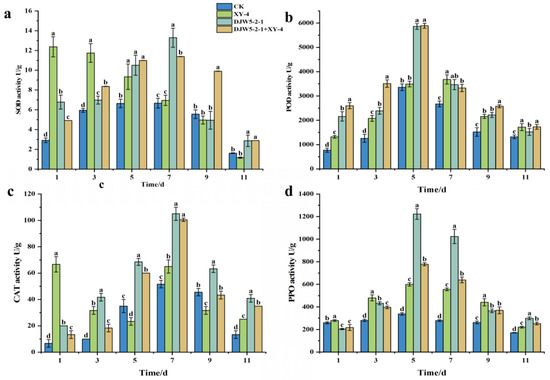 Effects of strain DJW5-2-1 on defense enzyme activities in rhododendron seedlings. (a) Effect on SOD activity; (b) effect on POD activity; (c) effect on CAT activity; (d) effect on PPO activity. Note: Different lowercase letters indicate significant differences at p < 0.05.