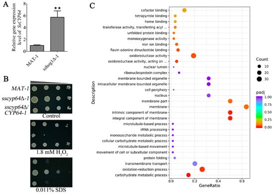 The role of SsCyp64 in oxidative stress response and cell membrane stability of S. scitamineum. (A) RT-qPCR was conducted to quantify the transcriptional levels of SsCYP64 in MAT-1 and sshog1Δ-1. Total RNA was isolated from MAT-1 and sshog1Δ-1 following 48 h of cultivation on YePSA medium. The analysis included three biological replicates, each consisting of three technical replicates. The error bars represent the means ± standard errors of the means (SEMs). Statistical significance was assessed via one-way analysis of variance (ANOVA) followed by Bonferroni’s multiple-comparison test (★★ p < 0.01; NS, not significant). (B) The tolerances of MAT-1, sscyp64Δ-1, and sscyp64Δ/CYP64-1 to 1.8 mM H2O2 or 0.011% SDS were evaluated. The haploid cells of the indicated strains were allowed to grow untill an OD600 of 1.0 was reached, after which 10-fold diluted cells were subsequently spotted onto YePSA medium with or without H2O2 or SDS. Images were taken 3–4 days after cultivation. The triangles indicate 10-fold serial dilutions from left to right. (C) Gene Ontology (GO) functional enrichment analysis of the transcriptome in the sscyp64Δ-1 vs. MAT-1 comparison. The haploid cells of the sscyp64Δ-1 and MAT-1 strains were allowed to grow to an OD600 of 1.0, and then spread on YePSA medium and cultured for 24 h. The fungal cells were subsequently collected for transcriptome sequencing. The size of each circle corresponds to the extent of enrichment, and the color gradient reflects the statistical significance. A p-value < 0.05 was considered statistically significant.