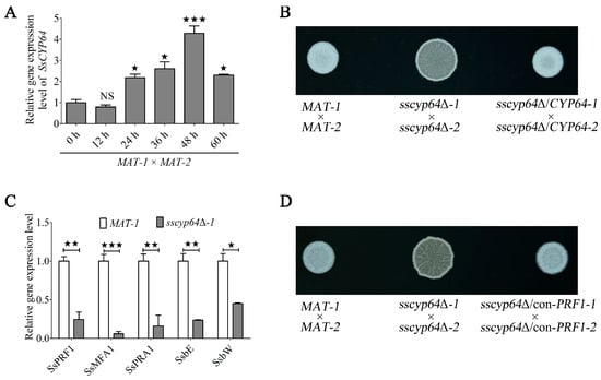 The role of SsCyp64 in the mating/filamentation and SsPRF1 transcription of S. scitamineum. (A) RT-qPCR was conducted to analyze the transcriptional profile of SsCYP64 during mating/filamentation in S. scitamineum. Total RNA was isolated from wild-type MAT-1 × MAT-2 at 0, 12, 24, 36, 48, and 60 h during mating/filamentation, and RT-qPCR was performed with ACTIN as an internal reference gene. The experiment included three biological replicates, each with three technical replicates. The error bars represent the means ± standard errors of the means (SEMs). Statistical significance was assessed via one-way analysis of variance (ANOVA) followed by Bonferroni’s multiple-comparison test (★ p < 0.05; ★★★ p < 0.001; NS, not significant). (B) Mating assay of the wild-type, SsCYP64 deletion mutant, and complementation strains. The haploid cells of the indicated strains were mixed (MAT-1 × MAT-2, sscyp64Δ-1 × sscyp64Δ-2, and sscyp64Δ/CYP64-1 × sscyp6464Δ/CYP64-1) and spotted onto YePSA plates. Following 48 h of incubation at 28 °C, colony morphology was recorded via a camera. (C) RT-qPCR analysis of SsPRF1 and its downstream target genes in the MAT-1 and the sscyp64Δ-1 strains. The haploid cells of the sscyp64Δ-1 and MAT-1 strains were allowed to grow to an OD600 of 1.0, and then spread on YePSA medium and cultured for 48 h. The fungal cells were subsequently collected for RNA extraction and RT-qPCR analysis. ACTIN was used as the internal control. Three independent biological replicates were performed, each consisting of three technical replicates. The error bars indicate the means ± standard errors of the means (SEMs). Statistical differences were evaluated using one-way ANOVA with Bonferroni’s multiple-comparison test (★ p < 0.05; ★★ p < 0.01; ★★★ p < 0.001). (D) Mating assay of the wild-type, SsCYP64 deletion mutant, and constitutively expressed SsPRF1 strains. The haploid cells of the indicated strains were mixed (MAT-1 × MAT-2, sscyp64Δ-1 × sscyp64Δ-2, and sscyp64Δ/con-PRF1-1 × sscyp64Δ/con-PRF1-2) and spotted onto YePSA plates. Following 48 h of incubation at 28 °C, colony morphology was recorded via a camera.