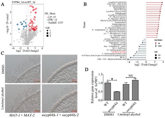 The role of γ-Linolenyl alcohol in the mating/filamentation and SsPRF1 transcription of SsCYP64 deletion mutant. (A) The overall distribution of differentially abundant metabolites in the CYP64-1 d vs. WT-1 d comparison group was visualized via a volcano plot. The x-axis represents the log2-fold change in each metabolite in the comparison group, whereas the y-axis indicates the negative log10-transformed p-value (p-value < 0.05). The size of each dot corresponds to the VIP (variable importance in projection) value derived from the OPLS-DA model, with larger dots indicating higher VIP values. The color of the dots reflects the direction of regulation: red for upregulated, blue for downregulated, and gray for nonsignificant metabolites. (B) Statistical analyses were performed on differentially abundant metabolites in the CYP64-1 d vs. WT-1 d comparison group which were visualized via a fireplot. The top 20 metabolites with the highest upregulation levels and all downregulated metabolites were selected for visualization. Blue represents downregulation, and red represents upregulation. The x-axis displays the log2-transformed fold change, and the color intensity of each dot represents the corresponding VIP value. The thresholds were set as VIP > 1.0, FC > 1.2 or FC < 0.833, and p-value < 0.05. (C) Evaluation of the effects of exogenous supplementation with γ-linolenyl alcohol on mating/filamentation in wild-type and SsCYP64 deletion mutants. The haploid cells of the indicated strains were mixed (MAT-1 × MAT-2 and sscyp64Δ-1 × sscyp64Δ-2) and spotted onto minimal medium supplemented with DMSO or 10.0 μM γ-linolenyl alcohol. Following 18 h of incubation at 28 °C, colony morphology was captured via a Zeiss stereomicroscope with a scale bar of 1.0 mm. (D) RT-qPCR analysis of SsPRF1 transcriptional levels following exogenous supplementation with γ-linolenyl alcohol. The haploid cells of the indicated strains were mixed (MAT-1 × MAT-2 and sscyp64Δ-1 × sscyp64Δ-2) and spread onto minimal medium supplemented with either DMSO or γ-linolenyl alcohol. After 36 h of incubation at 28 °C, total RNA was extracted and RT-qPCR was performed with ACTIN as an internal reference gene. Three independent biological replicates were conducted, each with three technical replicates. The error bars represent the means ± standard errors of the means (SEMs). Statistical significance was assessed via one-way ANOVA followed by Bonferroni’s multiple-comparison test to compare group means (★ p < 0.05; NS, not significant).
