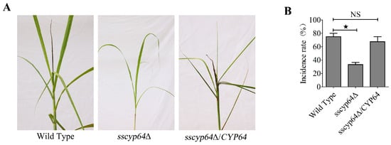 Given that SsCyp64 is involved in regulating the formation of dikaryotic hyphae in S. scitamineum, we investigated its potential role in pathogenic development. Five-leaf-stage seedlings of the susceptible sugarcane variety XTT22 were inoculated with the wild-type (MAT-1 × MAT-2), SsCYP64 deletion mutant (sscyp64Δ-1 × sscyp64Δ-2), or SsCYP64 complemented strain (sscyp64Δ/CYP64-1 × sscyp64Δ/CYP64-2). The results revealed that both the wild-type and complemented strains induced typical “black whip” symptoms in sugarcane seedlings (Figure 4A), accompanied by a high incidence rate (Figure 4B). In contrast, the SsCYP64 deletion mutants presented a significantly reduced disease incidence of only approximately 30% (Figure 4B). The complemented strains restored the disease incidence to approximately 70%, which was not significantly different from that of the wild-type strain (Figure 4A,B).