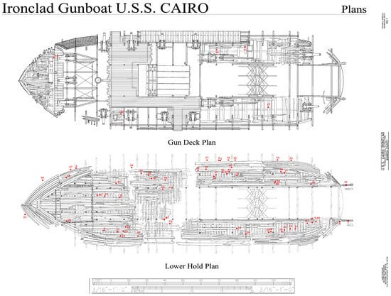 Diagram of the USS Cairo gunship, showing locations where wood samples were taken for analysis. A total of 67 samples, with red dots showing locations, were collected throughout the ship. Adapted from a photograph retrieved from the Library of Congress, <www.loc.gov/item/ms0291/> (accessed on 16 January 2025) Historic American Engineering Record, Creator, et al., photographed by Lowe, Jet, and Todd A Croteau. U.S.S. Cairo Ironclad, Vicksburg, Warren County, MS.