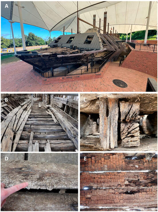 (A–E) The current condition of the ship and wood timbers. (A) The USS Cairo on display and under a protective canopy at the Vicksburg National Military Park in Vicksburg, Mississippi. (B,C) Ship timbers are eroded and degraded with large cracks evident. (D) White rot can be found in some woods where extensive degradation has resulted in most cells being destroyed except for the medullary ray parenchyma cells that resisted degradation. (E) Brown cubical rot typical of many brown rot fungi was found in some of the ship timbers.