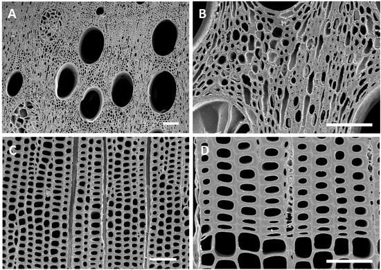(A–D) Transverse sections of modern sound white oak (A,B) and pine (C,D) wood showing cells with intact and unaltered cell walls. Bar = 100 µm.