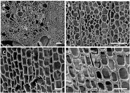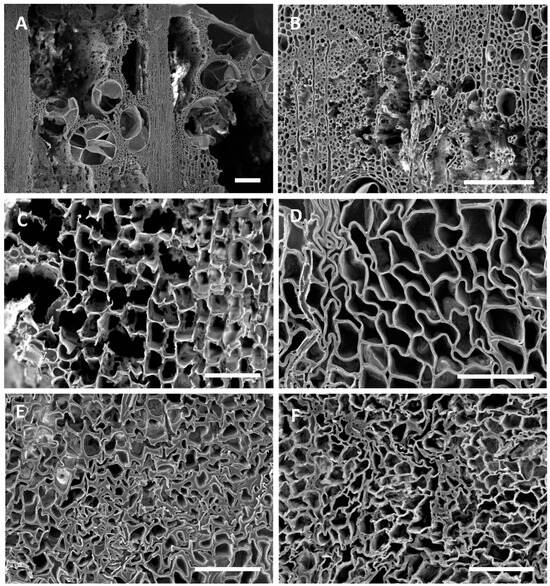 Wood identification of each ship timber sample was conducted to identify the wood species using microscopic analysis of anatomical structures [22]. Additional wood sections were also prepared for scanning electron microscopy using previously described methods [23]. Observations were made, and images were taken using a Hitachi S3500 scanning electron microscope (Hitachi, Tokyo, Japan). The type of decay was determined by examination of the micromorphological characteristics of the decayed wood caused by different types of wood-destroying microorganisms [2,10,13,17].