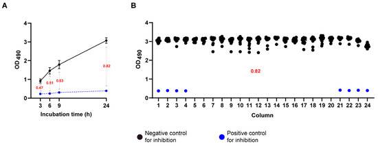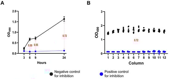 Optimization of experimental conditions for the 96-well plate assay. (A) Monitoring of the optimal incubation time for XTT reduction yielding the highest Z′ value; the blue line represents the OD490 readings from the positive control plate (Amb 10 µg/mL), the dark line represents the readings from the negative control plate (DMSO). (B) Representative Z′ assay using a positive and a negative control plate. Blue points represent one well of the positive control plate, while black points represent one of the negative control for inhibition. Numerical values in red indicate the calculated Z′ score at each time point, based on the corresponding control values.
