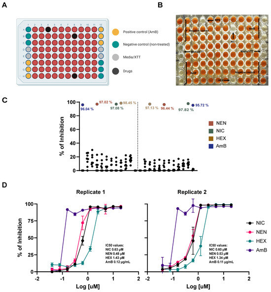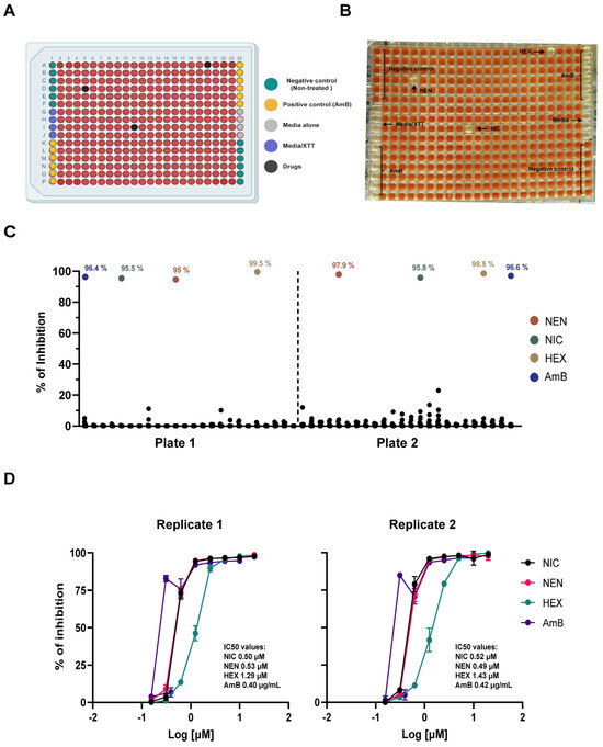 (A) Schematic view of a plate layout for a simulated primary screening experiment in a 96-well plate format. Wells in green represent the negative control for inhibition (untreated spherules), while wells in yellow correspond to the positive control (AmB). Gray wells indicate background controls, black wells represent drug-treated spherules, and red wells denote non-inhibition conditions (untreated, with XTT reduction). (B) Visual inspection of an XTT-based 96-well plate assay for drug screening. (C) Graphical representation of % of inhibition data from the “mock” primary screening performed in duplicate plates. Colored dots represent the percentage of inhibition of active drugs, while black dots represent non-inhibition wells. (D) Dose–response curves for each compound identified during the mock primary screening. IC50 values are calculated from concentration-dependent confirmatory experiments. Error bars represent standard deviations.