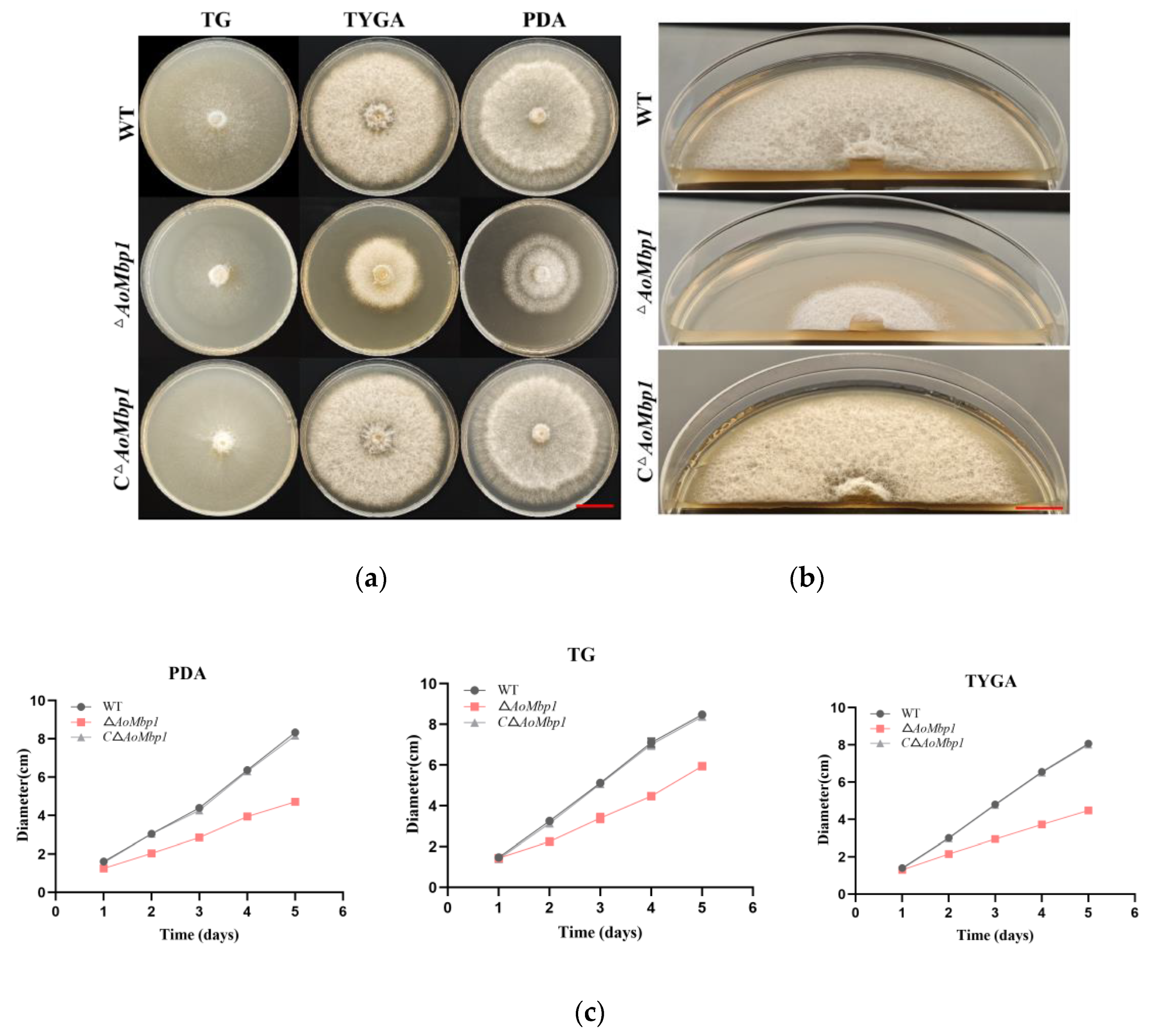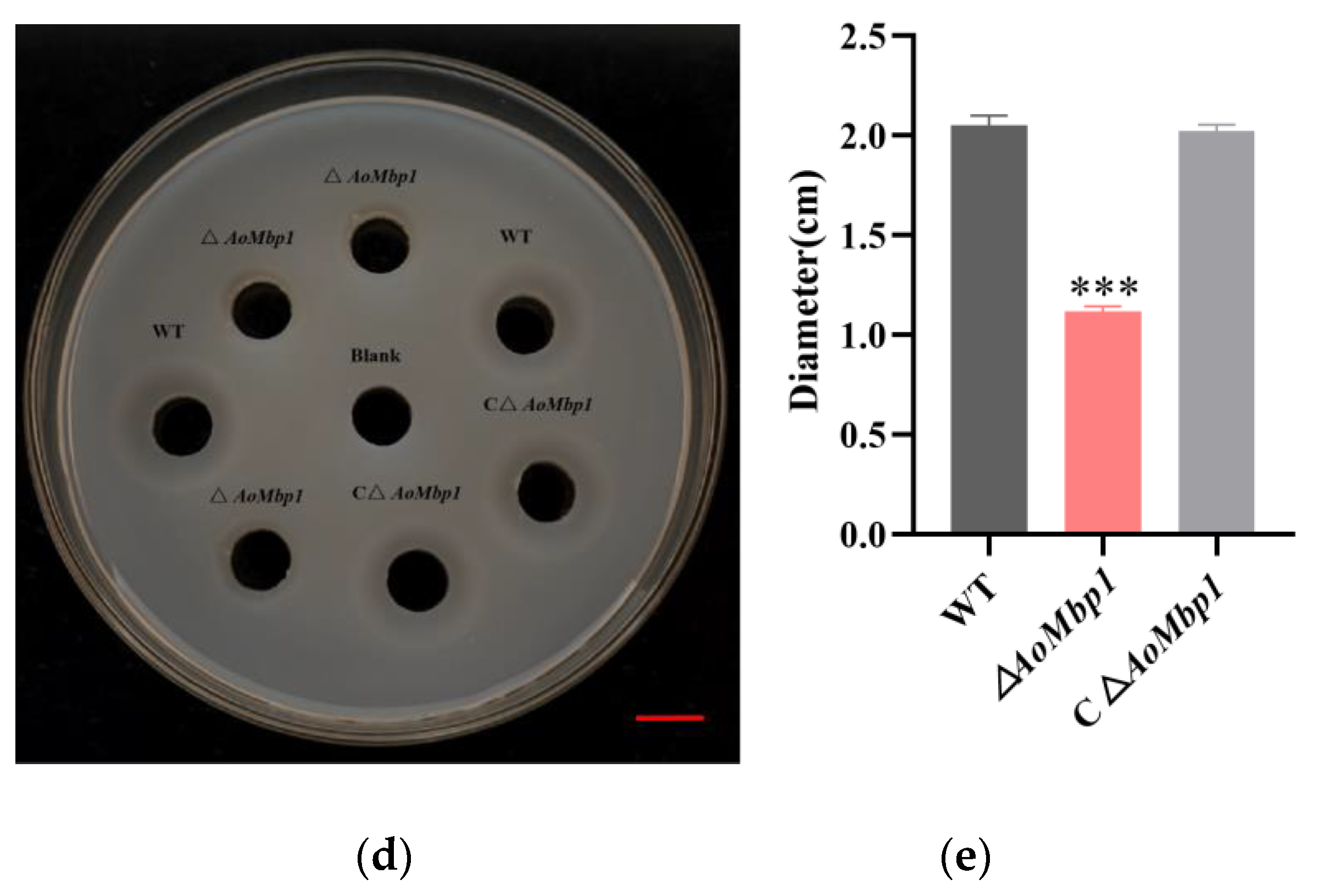 3.2. AoMbp1 Is Involved in the Regulation of Mycelial Growth
