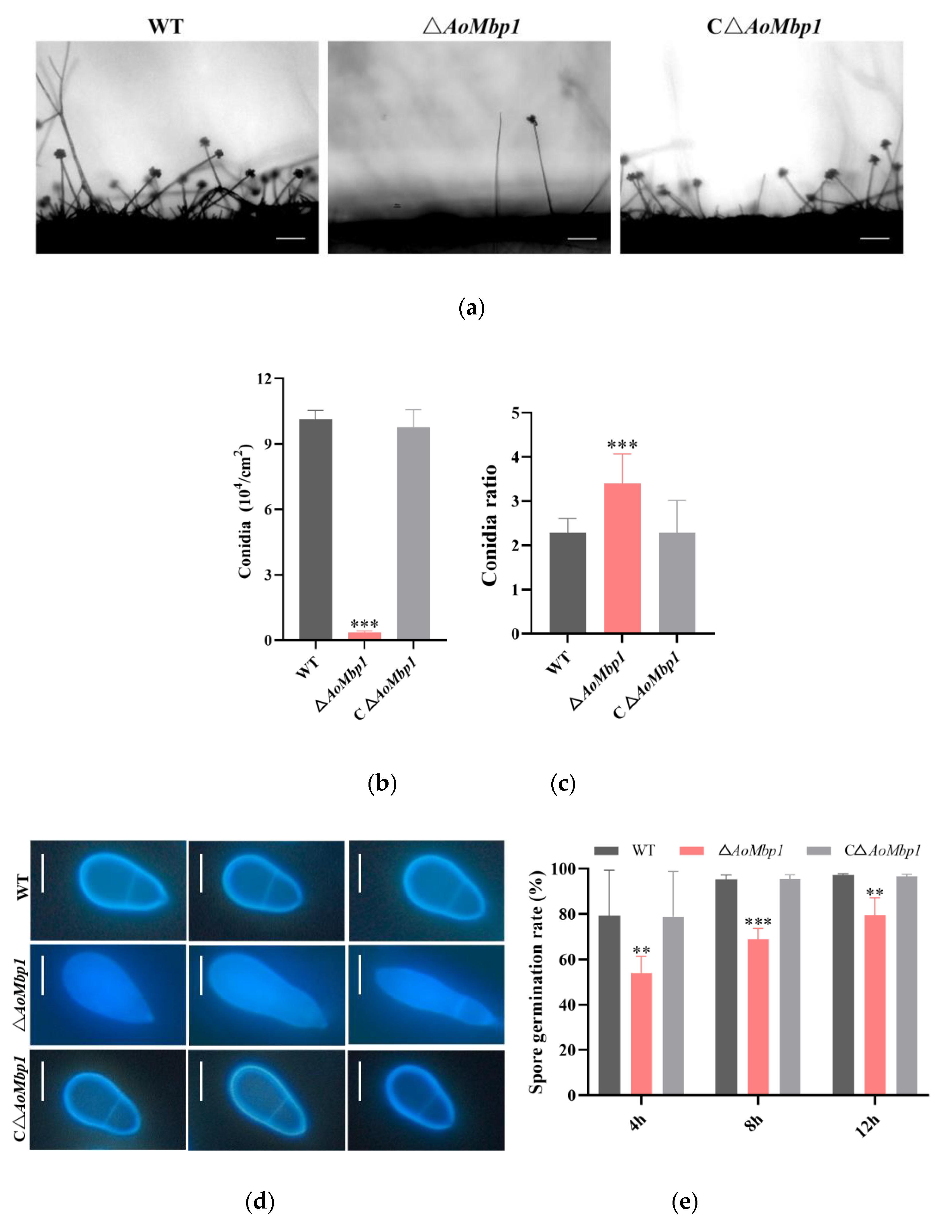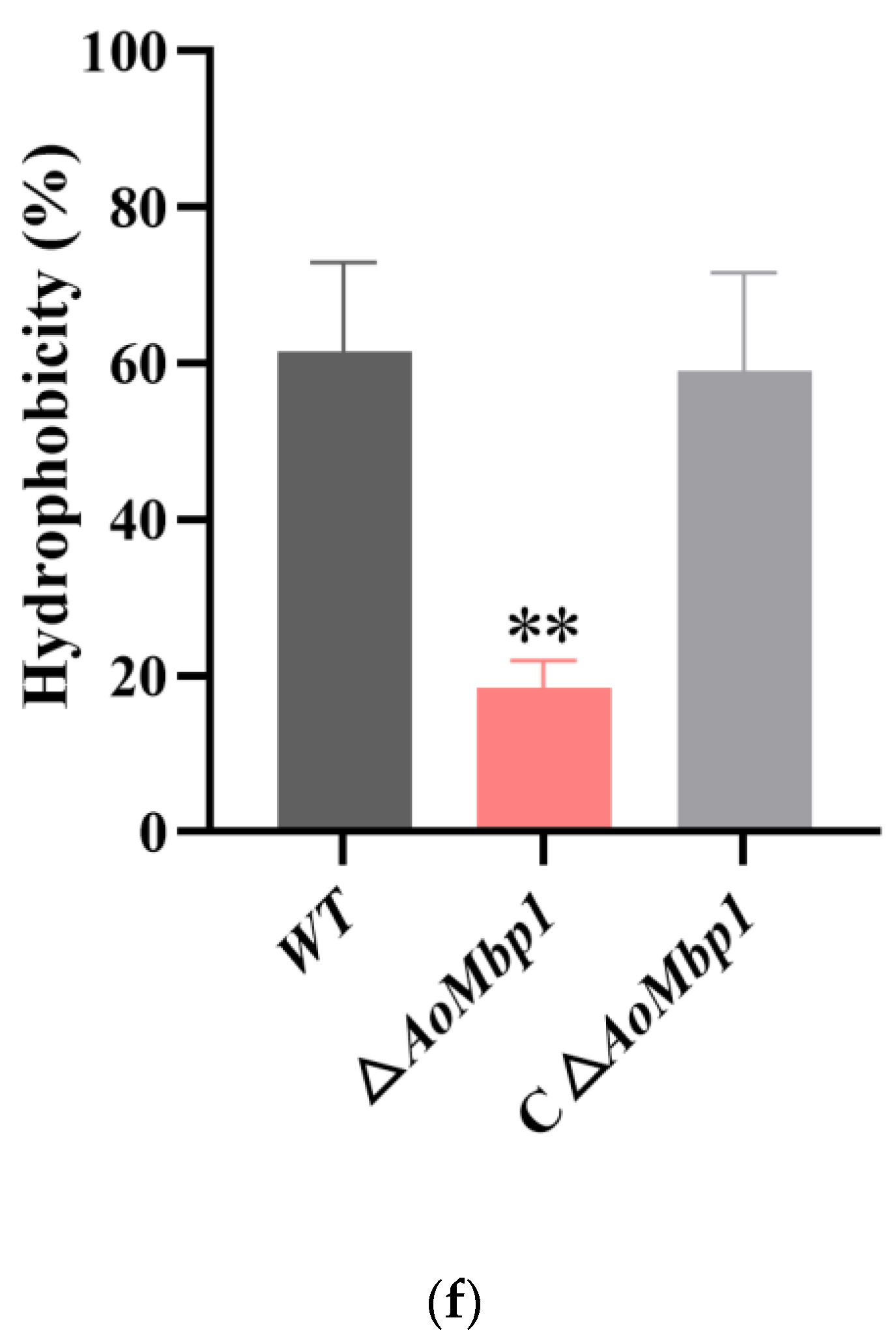 No significant differences were detected between the CΔAoMbp1 and WT strains. In contrast, the ΔAoMbp1 deletion strain produced fewer conidiophores (Figure 3a) and exhibited a marked reduction in conidial yield compared to both the WT and CΔAoMbp1 strains (Figure 3b). Approximately 84.28% of ΔAoMbp1 conidia displayed abnormal morphology. The length of WT conidia ranged from 18.24 to 27.55 μm (mean 21.31 μm), with a width of 7.38 to 12.07 μm (mean 9.44 μm). In comparison, ΔAoMbp1 conidia were 15.40–63.29 μm in length (mean 33.89 μm) and 4.74–20.29 μm in width (mean 10.39 μm). The length-to-width ratio of ΔAoMbp1 conidia was approximately 1.5 times greater than that of WT conidia, indicating an elongated and slender morphology; some conidia also exhibited incomplete septation (Figure 3c,d). The conidial germination rate of the ΔAoMbp1 strain was significantly lower than those of the WT and CΔAoMbp1 strains (Figure 3e). Furthermore, the hydrophobicity of the conidial surface was significantly reduced in the mutant (Figure 3f).