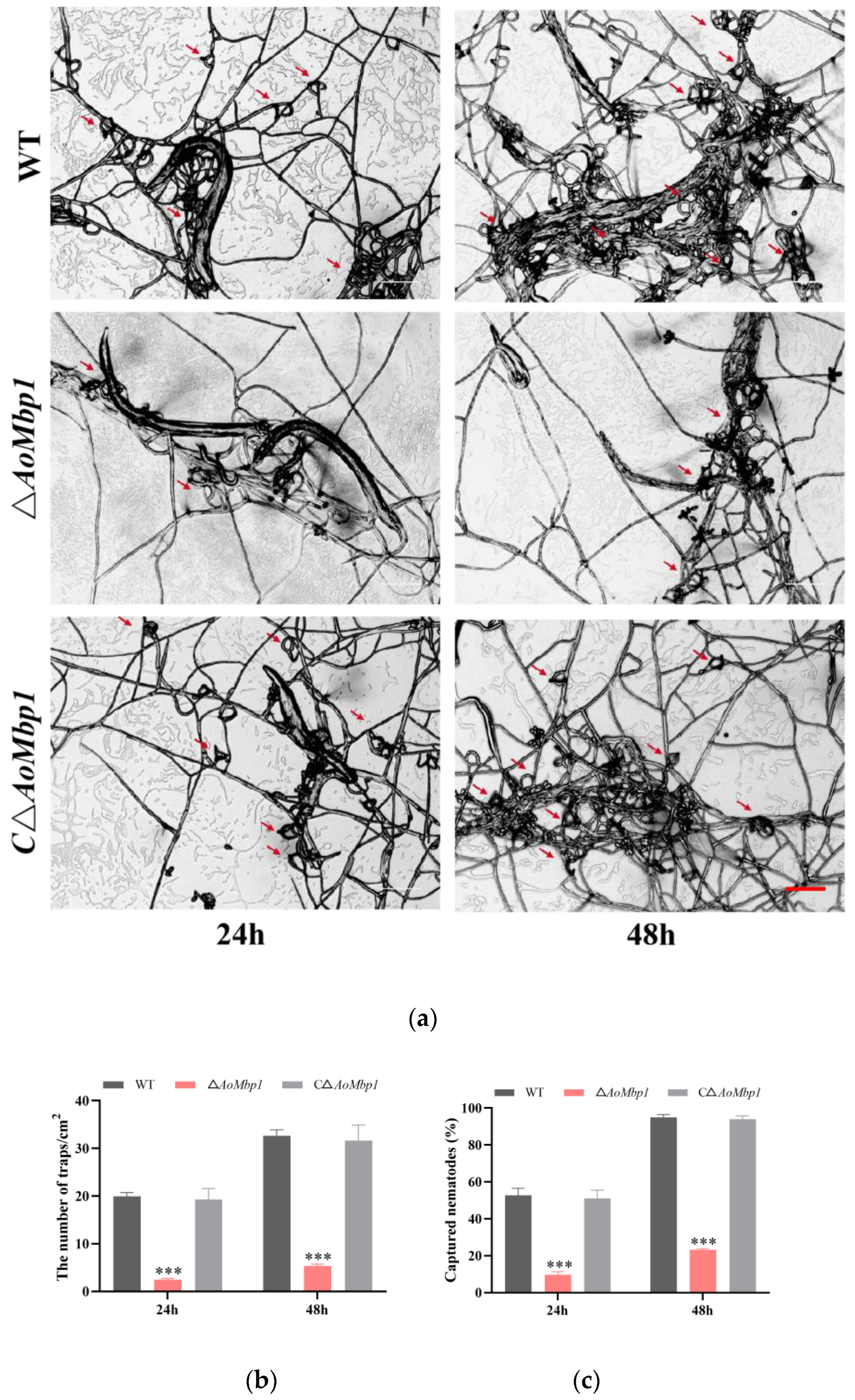 Figure 4. Deletion of AoMbp1 impairs trap formation, nematode predation, and extracellular protease activity. (a) Representative images of predatory traps at 24 h and 48 h post-induction with nematodes. Scale bar, 200 μm. (b) Quantification of trap numbers. Data are presented as mean ± SD (n = 3 independent biological replicates). *** p < 0.001 (one-way ANOVA with Tukey’s test). (c) Nematode predation rates. Values are mean ± SD (n = 3). *** p < 0.001. (d) Proteolytic activity assay on skim milk agar plates. Scale bar, 1 cm. (e) Diameters of proteolytic zones. Data represent mean ± SD (n = 3). *** p < 0.001.
