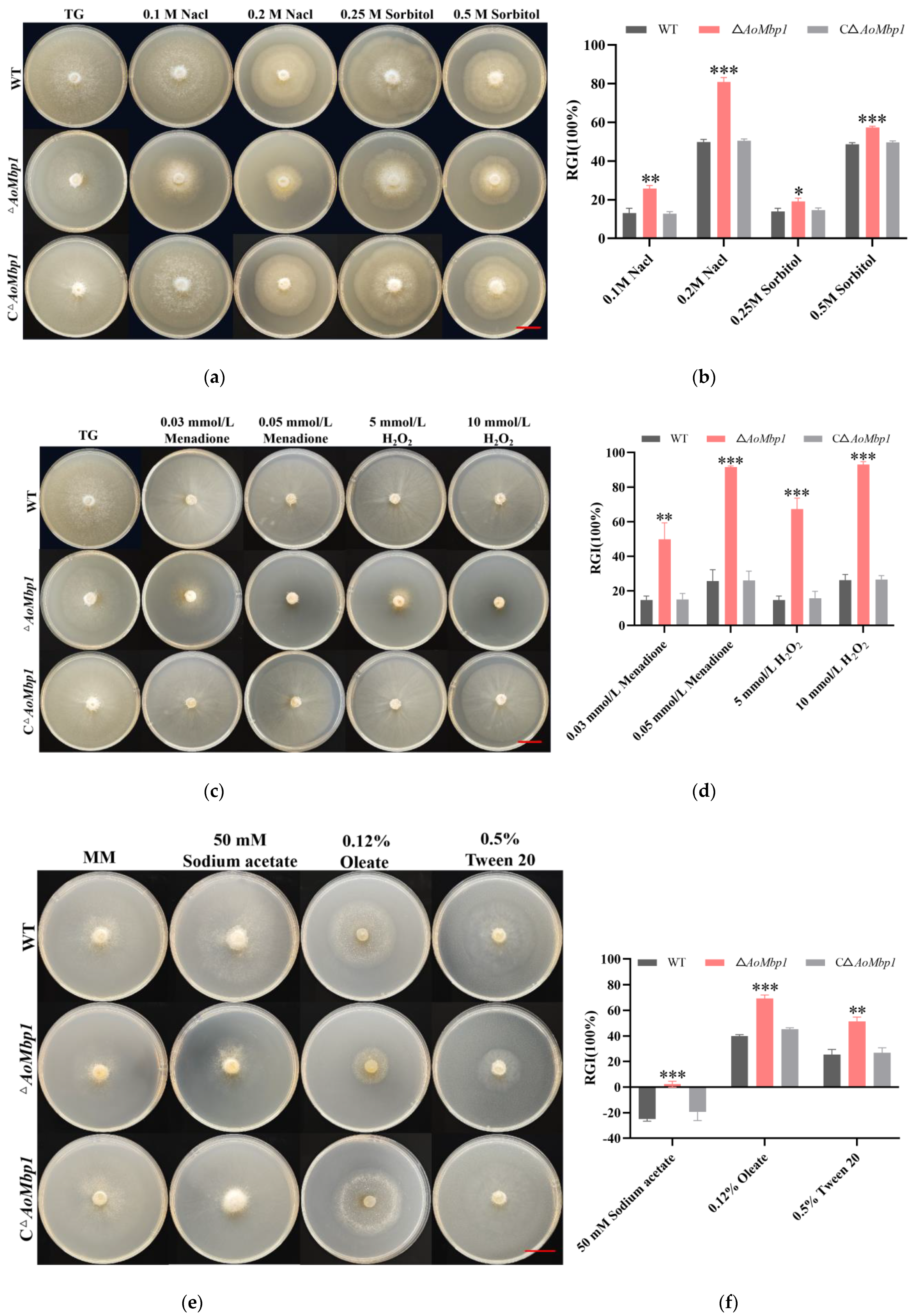 Figure 5. The ΔAoMbp1 strain displays increased sensitivity to hyperosmotic, oxidative, and nutrient stresses. (a) Colony morphology of WT, ΔAoMbp1, and CΔAoMbp1 strains on TG agar supplemented with NaCl (0.1, 0.2 M) or sorbitol (0.25, 0.5 M) after 5 days at 28 °C. Scale bar, 2 cm. (b) RGI of strains under hyperosmotic stress. Data are mean ± SD (n = 3 biological replicates). * p < 0.05, ** p < 0.01, *** p < 0.001 vs. WT (Tukey’s HSD test). (c) Colony morphology on TG agar containing H2O2 (5, 10 mM) or menadione (0.03, 0.05 mM). Scale bar, 2 cm. (d) RGI of strains under oxidative stress. Data are mean ± SD (n = 3). ** p < 0.01, *** p < 0.001 vs. WT. (e) Colony morphology on minimal medium (MM) with different fatty acid sources. Scale bar, 2 cm. (f) RGI of strains under fatty acid stress. Data are mean ± SD (n = 3). ** p < 0.01, *** p < 0.001 vs. WT. (g) Colony morphology on MM with different nitrogen sources. Scale bar, 2 cm. (h) RGI of strains grown on different nitrogen sources. Data are mean ± SD (n = 3). * p < 0.05, ** p < 0.01 vs. WT.