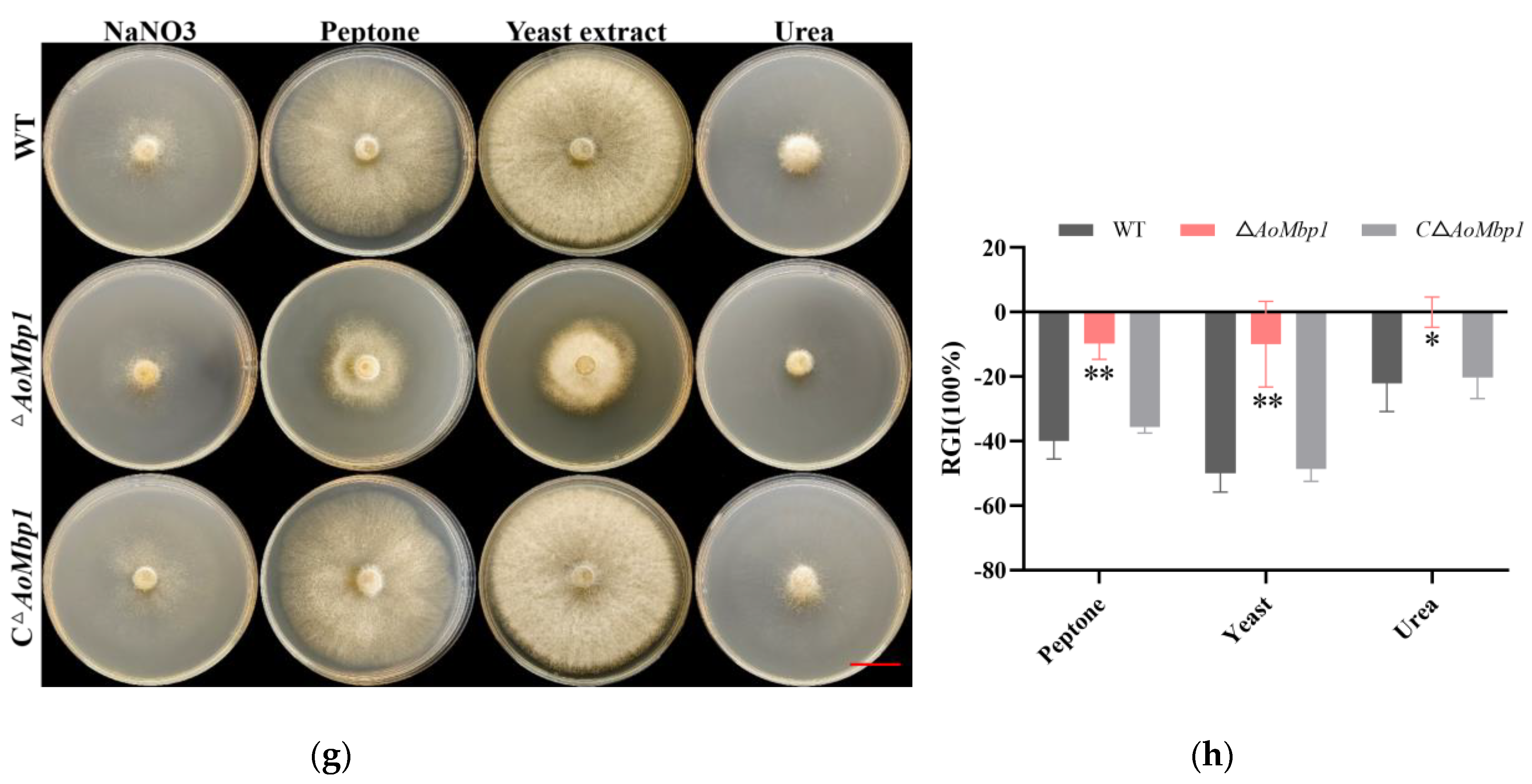 The ΔAoMbp1 deletion strain and CΔAoMbp1 complementation strain were constructed via homologous recombination (Figure S6a–d). Compared with the WT strain, the CΔAoMbp1 strain did not significantly differ. In contrast, the mycelia of the ΔAoMbp1 deletion strain presented a distinct trophic growth defect (Figure 2a), characterized by a flattened, compact colony morphology and a notable reduction in aerial mycelia (Figure 2b), relative to both the WT strain and the CΔAoMbp1 strain. Furthermore, the growth rates of the ΔAoMbp1 deletion strains were significantly lower on TG, TYGA, and PDA media (Figure 2c,d). Additionally, some hyphae were swollen and presented an increased number of mycelial septa (Figure 2e), resulting in shorter mycelial cell lengths (Figure 2f).
