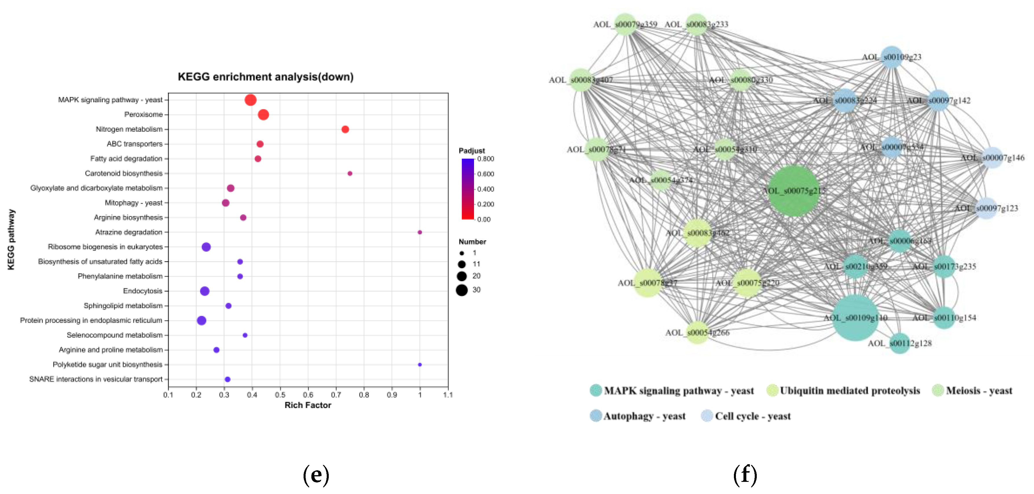 Using the STRING database, a protein interaction network was constructed to identify proteins potentially functionally related to or directly interacting with AoMbp1. These results suggest that AoMbp1 may play a regulatory role in several key cellular processes, such as the MAPK signaling pathway, ubiquitin-mediated protein hydrolysis, meiosis, autophagy, and cell cycle regulation (Figure 6f). Notably, combined transcriptome analysis revealed several specific proteins, including the mitogen-activated protein kinase Hog1 (AOL_s00109g23), which is linked to the MAPK pathway and mitophagy; the cyclin-dependent kinase Cdc28 (AOL_s00210g359), associated with meiosis, the cell cycle, and the MAPK pathway; and the serine/threonine protein kinase Cdc5 (AOL_s00078g71), involved in cell cycle regulation and meiosis. Additionally, the regulatory subunit B of protein phosphatase PP2A (AOL_s00007g146) was notable for its role in the cell cycle.