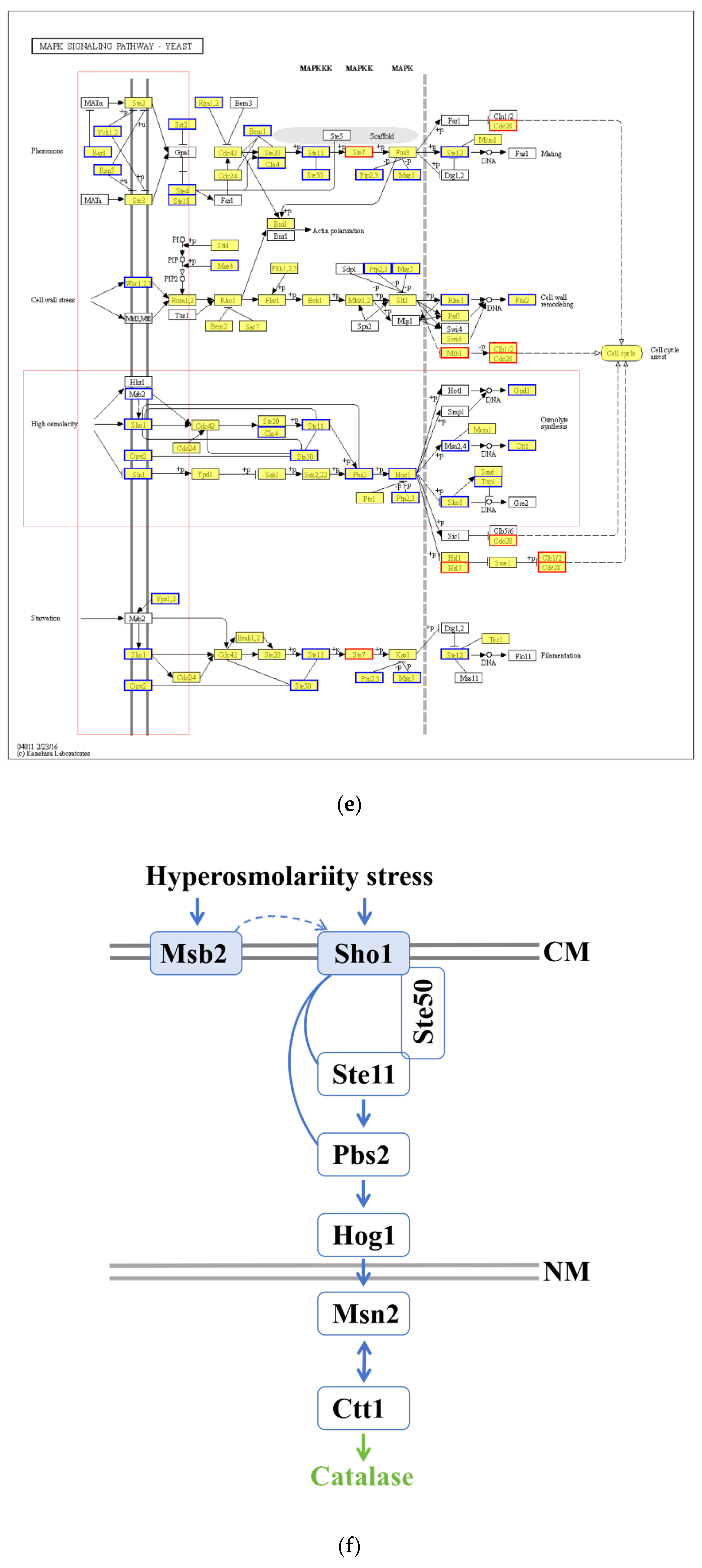 KEGG pathway enrichment analysis revealed that the upregulated DEGs were significantly enriched in pathways such as aminoacyl-tRNA biosynthesis, ribosome, nucleotide excision repair, DNA replication, the cell cycle (yeast), mismatch repair, and histidine metabolism (Figure 6d). In comparison, the downregulated DEGs were significantly enriched in pathways such as the mitogen-activated protein kinase (MAPK) signaling pathway, peroxisome pathway, and nitrogen metabolism pathway (Figure 6e).