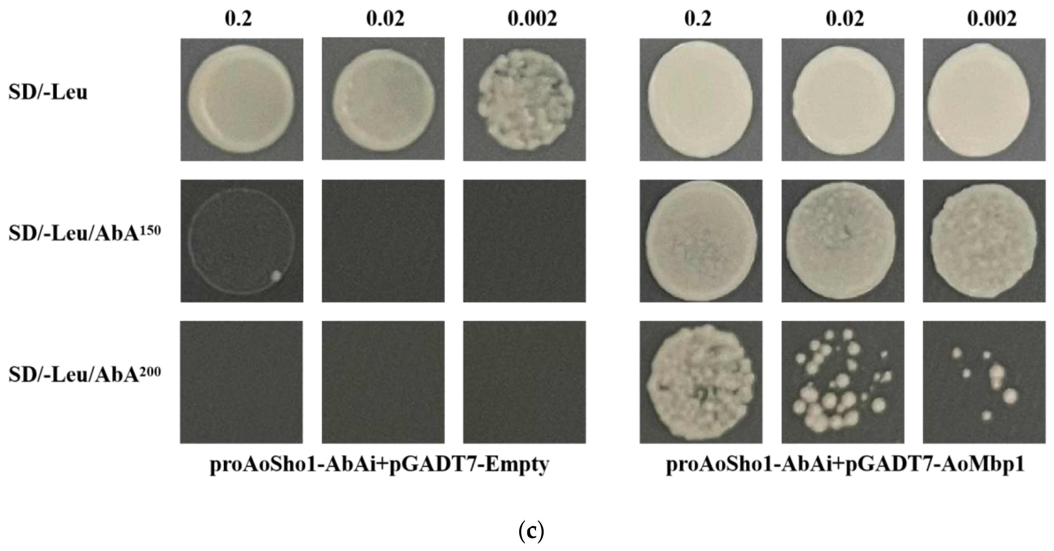 The promoter fragment of the target gene (1043 bp) was amplified via the primers proAoSho1-F/proAoSho1-R (Table S1). It was seamlessly ligated into the pAbAi vector, generating the recombinant bait vector proAoSho1-AbAi. This recombinant vector was subsequently transformed into Y1HGold yeast strains, and the transformants were cultivated on SD/-Ura media to develop the yeast bait strain. The appropriate AbA screening concentration was then determined. Simultaneously, the full-length cDNA sequence of AoMbp1 was amplified via the primers AoMbp1-F/AoMbp1-R (Table S1). It was ligated into the pGADT7 vector to construct the pGADT7-AoMbp1 vector. The pGADT7-AoMbp1 plasmid, along with the pGADT7 empty plasmid (serving as the negative control), was transformed into yeast bait strain receptor cells. The transformation products were plated on SD/-Leu/-Ura media and incubated at a constant temperature of 30 °C for 3–5 days. After that, the positive clones identified on the primary screening plates were cultured overnight in liquid SD/-Leu media, and the resulting cultures were diluted to OD600nm values of 0.2, 0.02, and 0.002. These dilutions were subsequently spotted onto SD/-Leu/AbA screening media containing the same AbA concentration. The plates were subsequently sealed and incubated at 30 °C for 3–5 days, after which growth was observed.