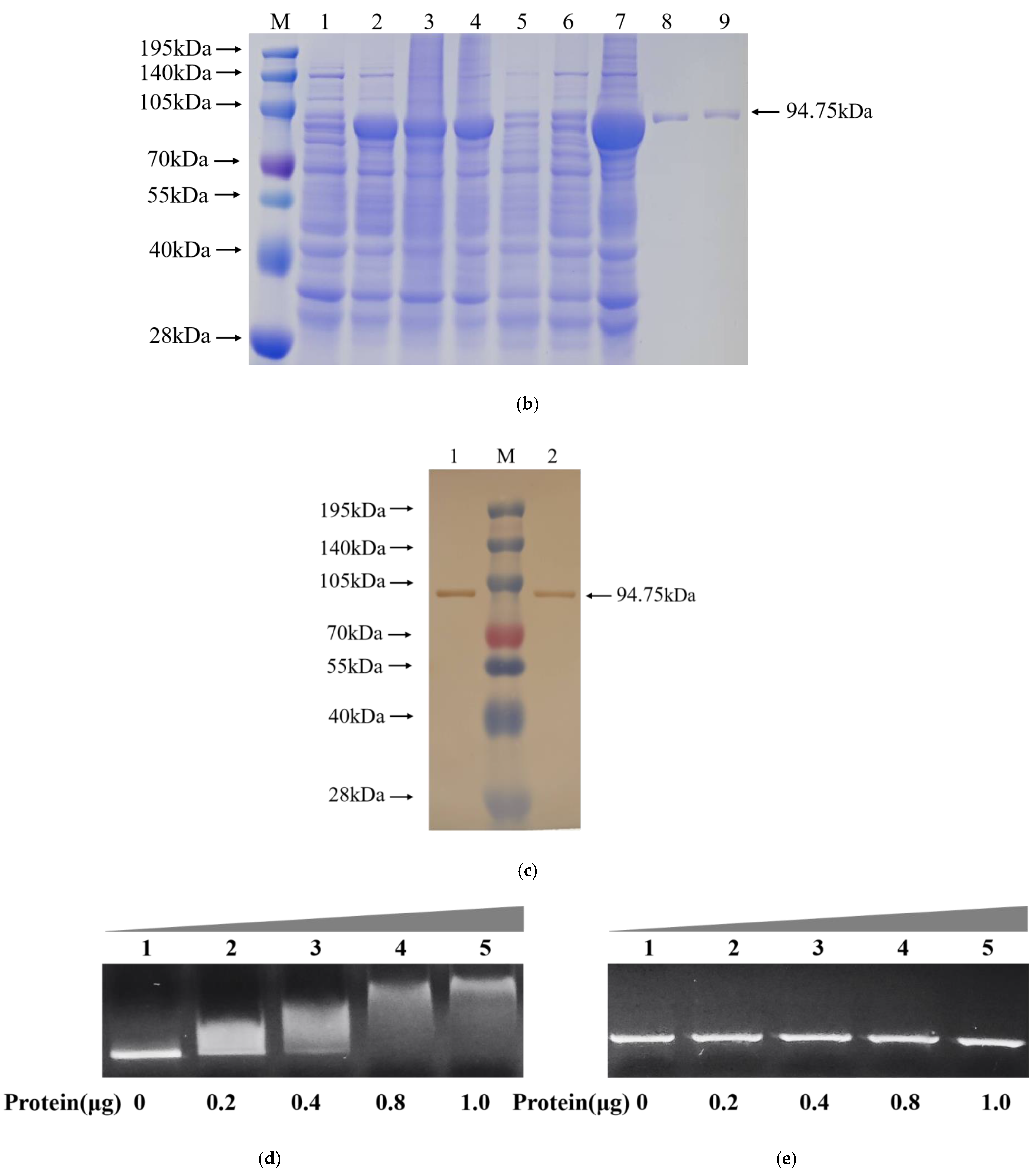Figure 9. EMSA analysis of the interaction between AoMbp1 and the AoSho1 promoter. (a) Identification of recombinant plasmid pET-32a-AoMbp1 by double enzyme digestion. M, DNA marker; lane 1, double enzyme digest of pET-32a-AoMbp1. (b) Expression analysis of the recombinant AoMbp1 protein. M, prestained protein marker; lane 1, pET-32a vector induced for 6 h; lanes 2–4, precipitate of induced recombinant protein; lane 5, uninduced control; lane 6, supernatant after cell lysis; lane 7, precipitate after lysis; lanes 8–9, purified AoMbp1 protein. (c) Western blot analysis of the recombinant AoMbp1 protein. (d) EMSA showing the binding of purified AoMbp1 protein to the AoSho1 promoter. (e) Negative control showing no binding of BSA to the AoSho1 promoter.