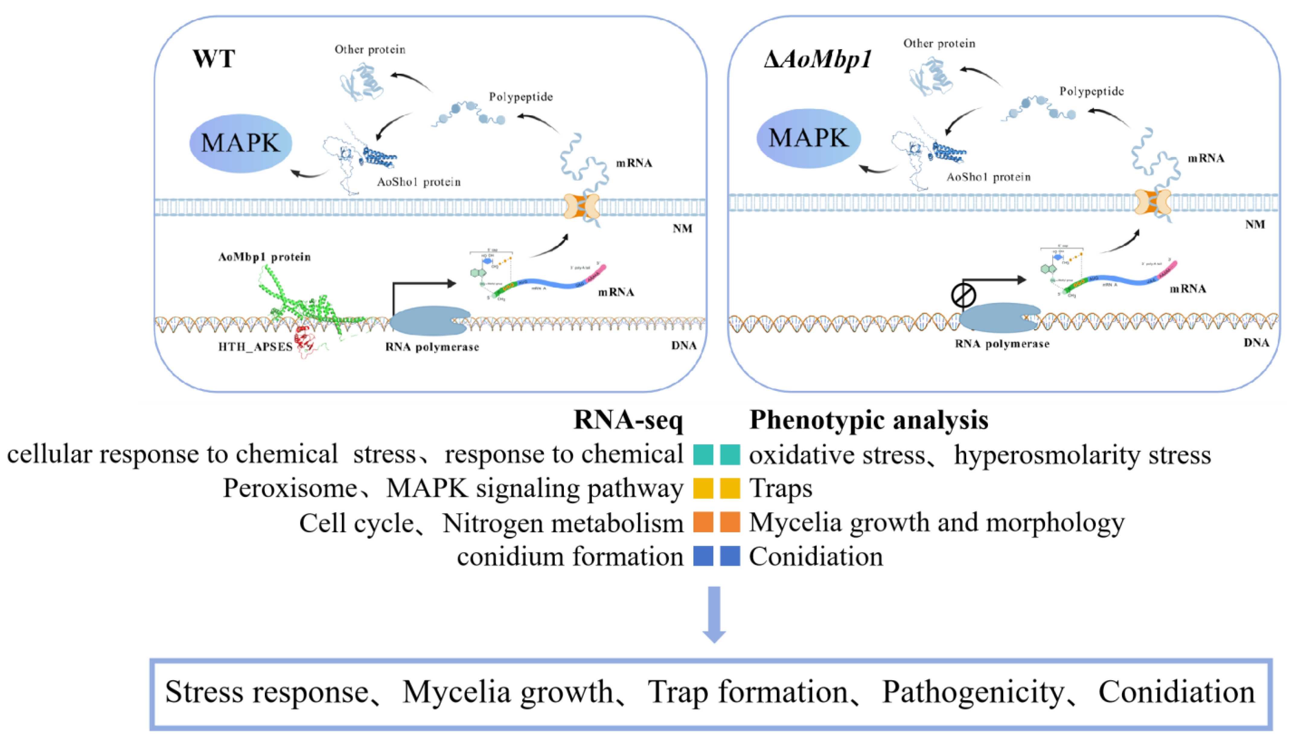 Taken together, our analyses demonstrate that deletion of AoMbp1 leads to severe phenotypic defects, including restricted mycelial growth, abnormal hyphal morphology, significantly impaired conidiation with aberrant conidial morphology, markedly reduced trap formation, and enhanced sensitivity to osmotic and oxidative stresses. Transcriptome profiling further validated these phenotypic observations, collectively confirming the essential role of AoMbp1 in regulating hyphal development, conidiation, stress adaptation, and pathogenicity in A. oligospora (Figure 10).
