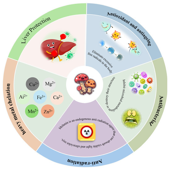Tang, J.; Shen, H.; Lv, W.; Zhang, J.; Fu, J. Edible Fungi Melanin: Recent Advances in Extraction, Characterization, Biological Activity and Applications. J. Fungi 2025, 11, 738. https://doi.org/10.3390/jof11100738
