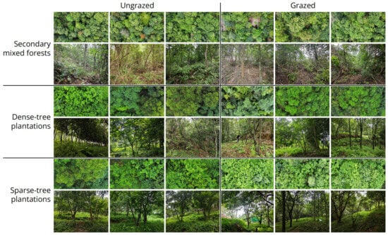 Within each forest type, two areas were designated: one subjected to grazing at an intensity of 10 goats per hectare for two years, and one left untreated as a control. This resulted in six plot types (grazed secondary mixed forests, ungrazed secondary mixed forests, grazed dense-tree plantations, ungrazed dense-tree plantations, grazed sparse-tree plantations, and ungrazed sparse-tree plantations; Figure 1). Within each plot, three 400 m2 quadrats were established, each further divided into four 100 m2 subquadrats.