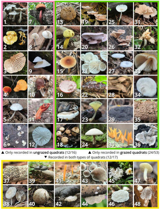 Representative macrofungal species unique to ungrazed quadrats (1–12, showing 12 of 16), unique to grazed quadrats (13–36, showing 24 of 53), or shared in both types of quadrats (37–48, showing 12 of 17): (1) Termitomyces boluoshanensis; (2) Tricholomopsis flava; (3) Clitopilus hobsonii; (4) Pycnoporus sinoruber; (5) Micropsalliota pseudoarginea; (6) Hyalorbilia sp.; (7) Boletellus aurocontextus; (8) Tetrapyrgos parvispora; (9) Chaetocalathus galeatus; (10) Candolleomyces rubrobrunneus; (11) Lysurus mokusin; (12) Amparoina heteracantha; (13) Pisolithus albus; (14) Pulveroboletus icterinus; (15) Tricholomopsis rubroaurantiaca; (16) Auricularia cornea; (17) Ganoderma gibbosum; (18) Vascellum curtisii; (19) Daedalea atypa; (20) Neonothopanus nambi; (21) Paramarasmius palmivorus; (22) Cyathus striatus; (23) Gerronema kuruvense; (24) Agaricus praeclarefibrillosus; (25) Pluteus griseodiscus; (26) Schizophyllum commune; (27) Clitopilus crispus; (28) Micropsalliota globocystis; (29) Annulohypoxylon nitens; (30) Calocera sinensis; (31) Collybiopsis indocta; (32) Entoloma omiense; (33) E. luteum; (34) Favolus acervatus; (35) Trichaptum abietinum; (36) Kretzschmaria iranica; (37) Graphis scripta; (38) Stygiomarasmius scandens; (39) Sanguinoderma rugosum; (40) Scleroderma yunnanense; (41) Sulzbacheromyces sinensis; (42) Neofomitella guangxiensis; (43) Resupinatus applicatus; (44) Trametes hirsuta; (45) Tremella fuciformis; (46) Truncospora ochroleuca; (47) Gerronema microcarpum; (48) Coprinopsis urticicola.
