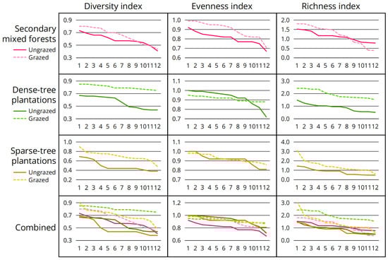 Analysis of diversity indices (Table 4; Figure 3) revealed two patterns: (1) diversity and richness indices generally increased after grazing, with a significant increase in dense-tree plantations and sparse-tree plantations and a minor to moderate increase in secondary mixed forests; and (2) changes of evenness index varied by forest types, with a significant increase in secondary mixed forests, a moderate decrease in dense-tree plantations and almost no change in sparse-tree plantations.