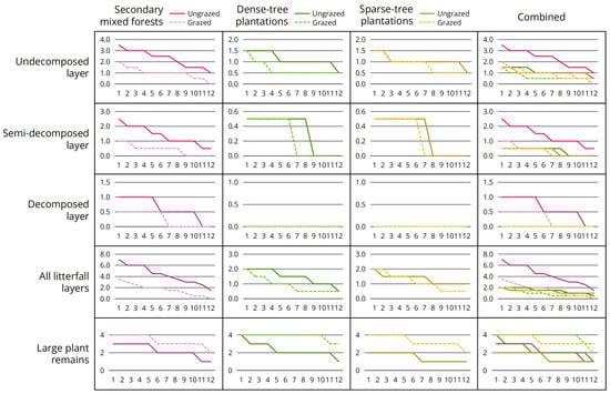 Analysis of environmental factors of interest (Table 12; Figure 4) revealed two patterns: (1) Litterfall thickness decreased significantly after grazing, with the most pronounced decline observed in undecomposed layer; (2) Abundance of large plant remains increased significantly after grazing.