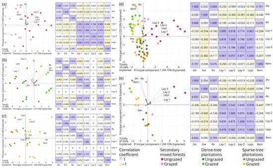 Principal component analyses (PCA) for characterization indices of macrofungal diversity and environmental factors of interest before and after grazing. (a) Secondary mixed forests, with 24 subquadrats as minimum units; (b) dense-tree plantations, with 24 subquadrats as minimum units; (c) sparse-tree plantations, with 24 subquadrats as minimum units; (d) three forest types integrated, with 72 subquadrats as minimum units; (e) three forest types integrated, with 18 quadrats as minimum units. Abbreviations: (Div) Simpson’s index of diversity; (Eve) Pielou’s index of evenness; (Ric) Margalef’s index of richness; (Lay-1) thickness of undecomposed layer; (Lay-2) thickness of semi-decomposed layer; (Lay-3) thickness of decomposed layer—note that this is excluded from the PCA calculation of (b,c) where its variance is zero; (Lays) thickness of all litterfall layers; (Rem) abundance of large plant remains.