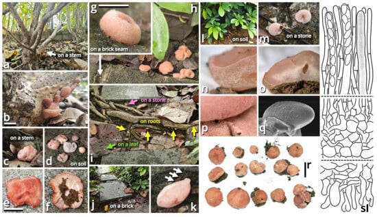 Purpureodiscus masticophilus (photos by Kun L. Yang & Jia Y. Lin; drawings by Kun L. Yang from HKAS150755 (holotype)). (a–r) Ascomata and their habitats. (a,b) HTBM2877, growing on a stem of Hibiscus rosa-sinensis; (c) HTBM2878, growing on a stem of Hibiscus rosa-sinensis, note the whitish to yellowish subiculum (see also (p)); (d) HTBM2447, growing on soil, without a subiculum (see also o); (e,f) HTBM2874 placed on ground, originally growing on a stem of Hibiscus rosa-sinensis; (g,h) HTBM2489, a group of ascomata found on soil covered by a thick litter layer, with an isolated, tiny ascoma situated on a near brick seam; note that an indistinct subiculum surrounding the ascoma can be recognized; (i) HTBM2491, a group of ascomata occurring in various microhabitats, including a stone (see also (m)), a leaf and roots of Talipariti tiliaceum; (j,k) HTBM2490, two ascomata clinging on a brick with a subiculum soaked by dark algae (one manually raised from the brick, showing the detached subiculum traced by white arrows); (l) HKAS150755 (holotype), a group of ascomata growing on soil under Heptapleurum arboricola (see also (n,r)); (m) HTBM2491, two ascomata clinging on a stone (see also (i)); (n) close-up of the external surface of an ascoma from HKAS150755 (holotype) (see also (l,r)); (o) close-up of the longitudinal section of an ascoma from HTBM2447 (see also d), worm channels frequently present; (p) close-up of the subiculum surrounding an ascoma from HTBM2878 (see also (c)); (q) an ascospore from HKAS150755 (holotype) under SEM, note the fine, sparsely verrucose ornamentation; (r) ascomata from HKAS150755 (holotype) (see also (l,n)). (s) Microstructures in a longitudinal section, including the top part of hymenium (top), the transition area from hymenium to excipulum (middle), and the external surface (bottom). Bars: (b,e,r) = 1 cm, (g) = 1 mm, (s) = 10 µm.