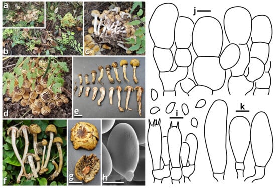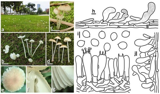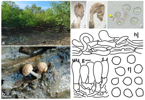 - Yang, K.L.; Lin, J.Y.; Li, G.-M.; Yang, Z.L. Mushrooms adapted to seawater: Two new species of Candolleomyces (Basidiomycota, Agaricales) from China. J. Fungi 2023, 9, 1204. [Google Scholar] [CrossRef]