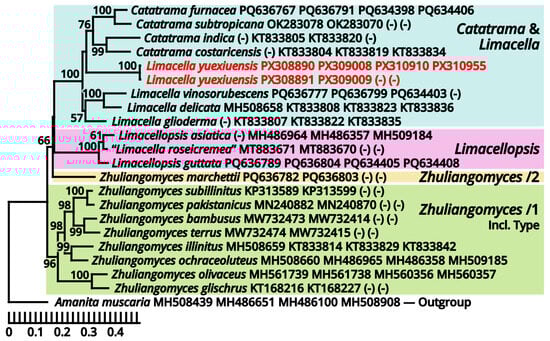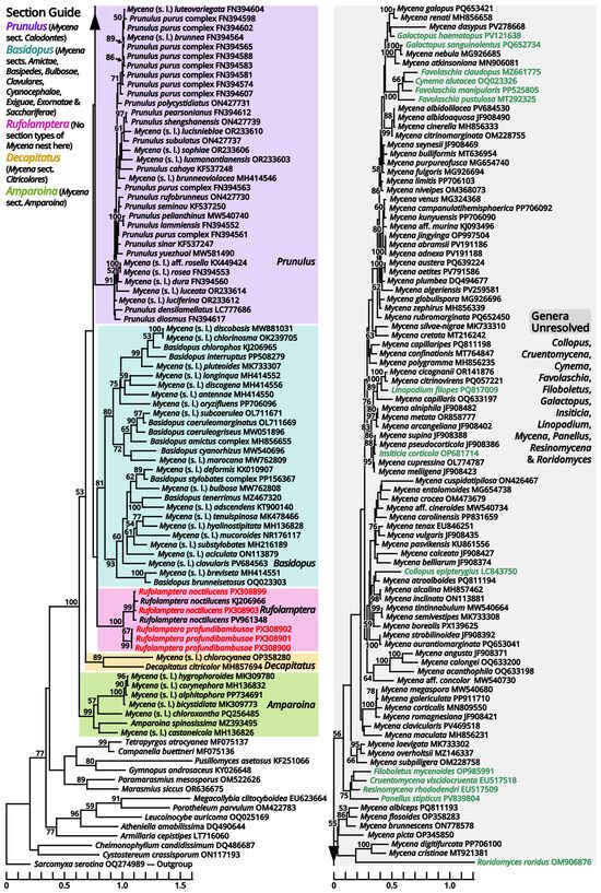 - Wang, G.S.; Cai, Q.; Hao, Y.J.; Bau, T.; Chen, Z.H.; Li, M.X.; David, N.; Kraisitudomsook, N.; Yang, Z.L. Phylogenetic and taxonomic updates of Agaricales, with an emphasis on Tricholomopsis. Mycology 2023, 15, 180–209. [Google Scholar] [CrossRef] [PubMed]